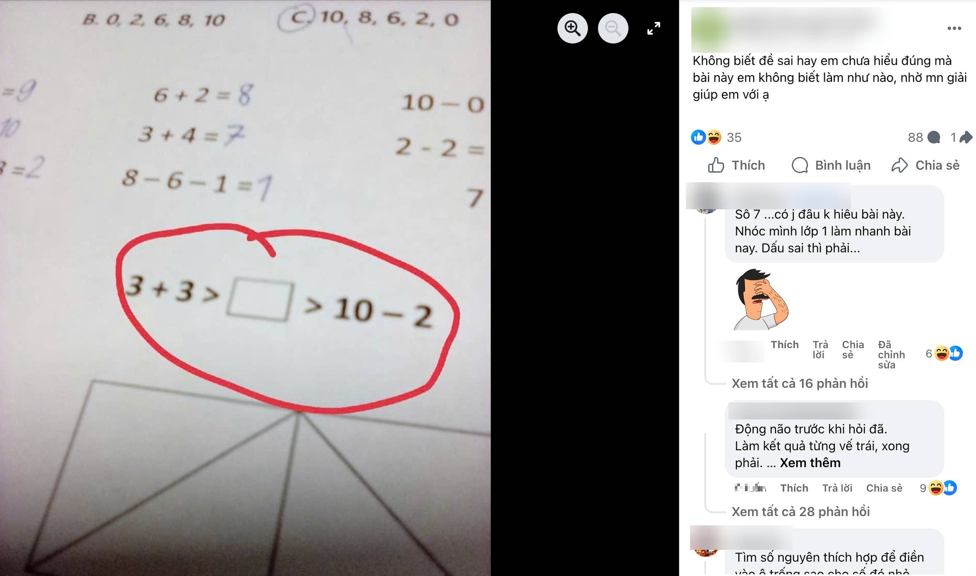 Tuy nhiên, nhiều phụ huynh khác phản bác mạnh mẽ: nếu đề in như hình thì rõ ràng là sai. Không thể yêu cầu học sinh lớp 1 tự suy luận rằng “máy in bị ngược dấu” để sửa đề rồi làm tiếp. Nhiều phụ huynh cho biết con họ loay hoay rất lâu, không hiểu vì sao làm mãi không ra. Khi trẻ chưa đủ khả năng phản biện đề bài, việc gặp lỗi như vậy dễ tạo tâm lý hoang mang.