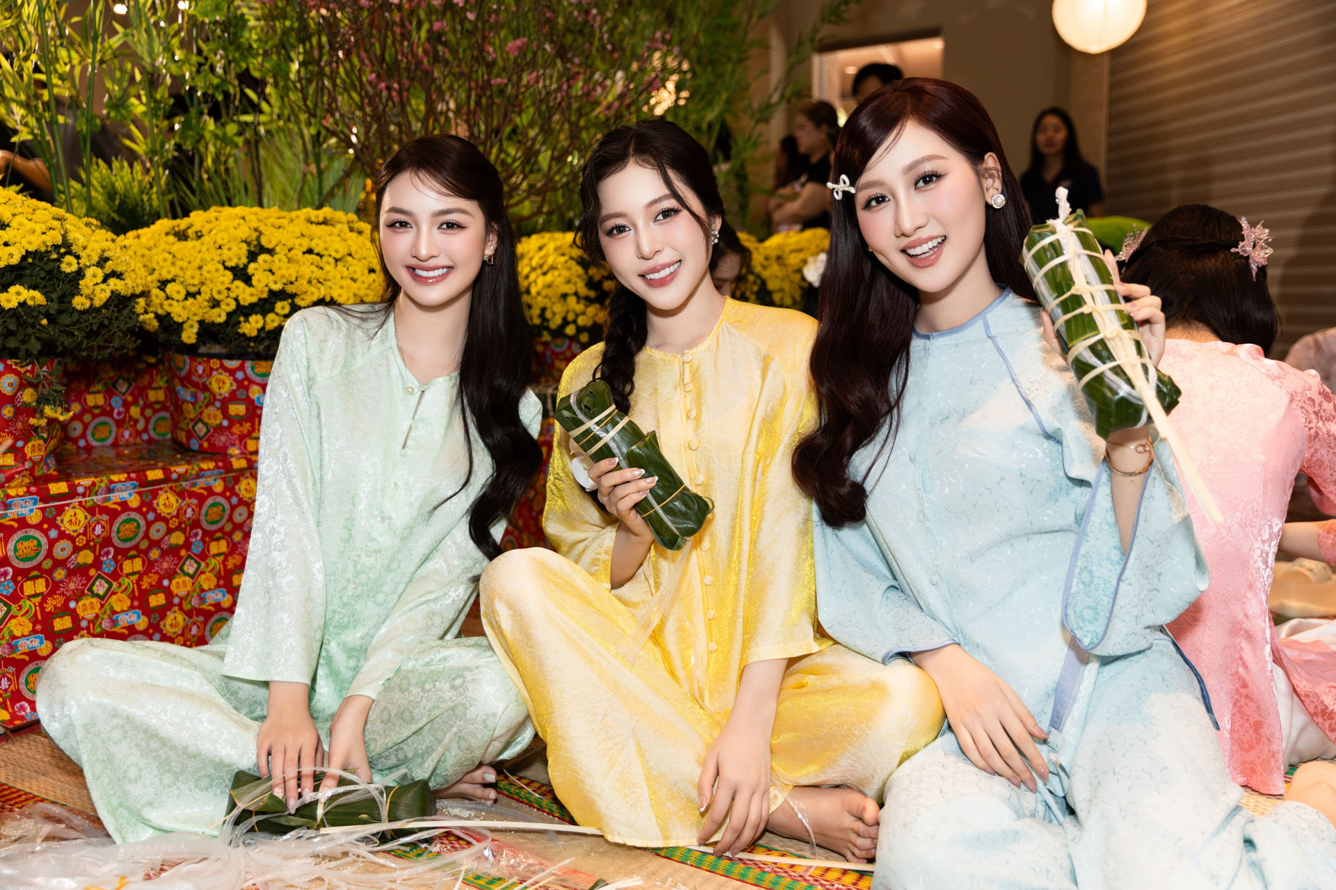CEO Phạm Kim Dung, đạo diễn Hoàng Nhật Nam cùng dàn Hoa hậu, Á hậu và Nam – Á vương đã trực tiếp trải nghiệm các công đoạn gói bánh, từ chuẩn bị lá dong, đong gạo, xếp nhân đến buộc lạt dưới sự hướng dẫn tận tình của các nghệ nhân làm bánh lâu năm.