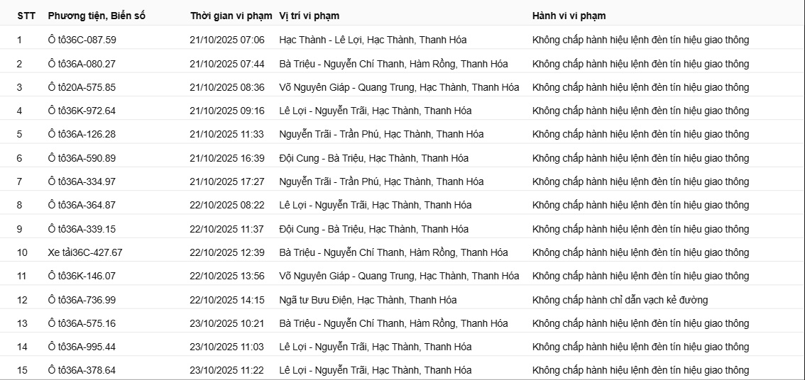 Công an tỉnh Thanh Hóa thông báo, từ ngày 21/10/2025 đến ngày 31/10/2025, thông qua thiết bị kỹ thuật nghiệp vụ, các tổ công tác của phòng CSGT đã phát hiện, ghi nhận bằng hình ảnh 129 trường hợp phương tiện không chấp hành đúng các quy định về TTATGT đường bộ. Danh sách biển số vi phạm cụ thể như sau: