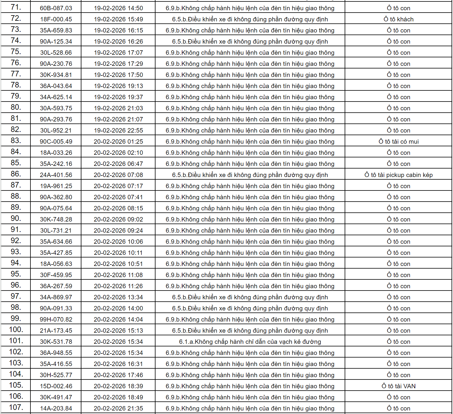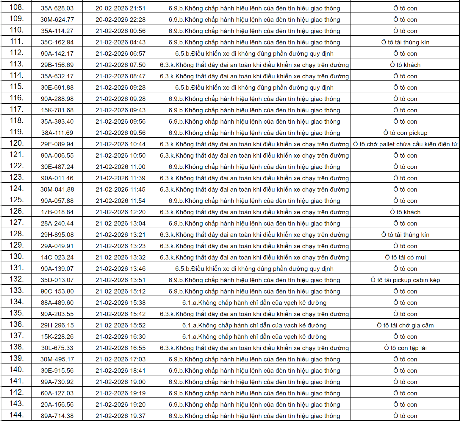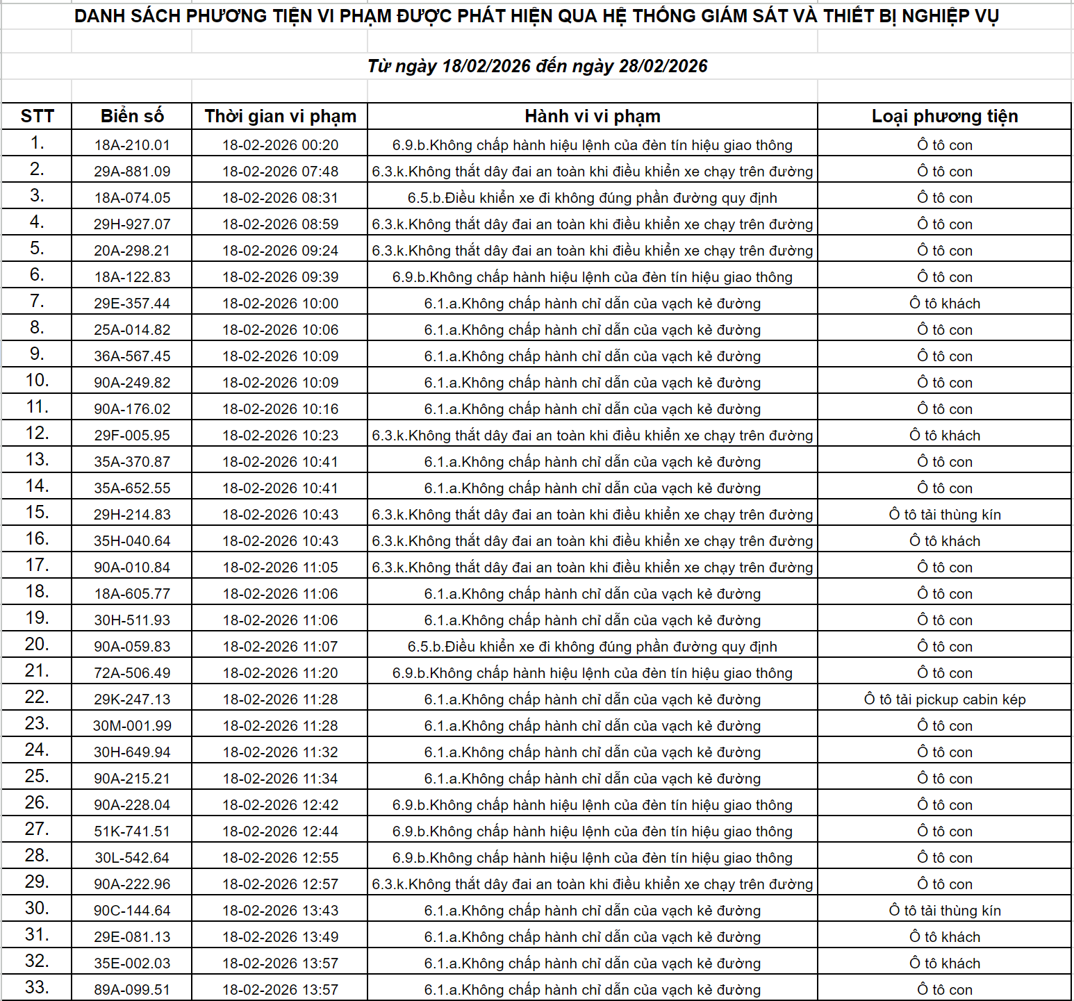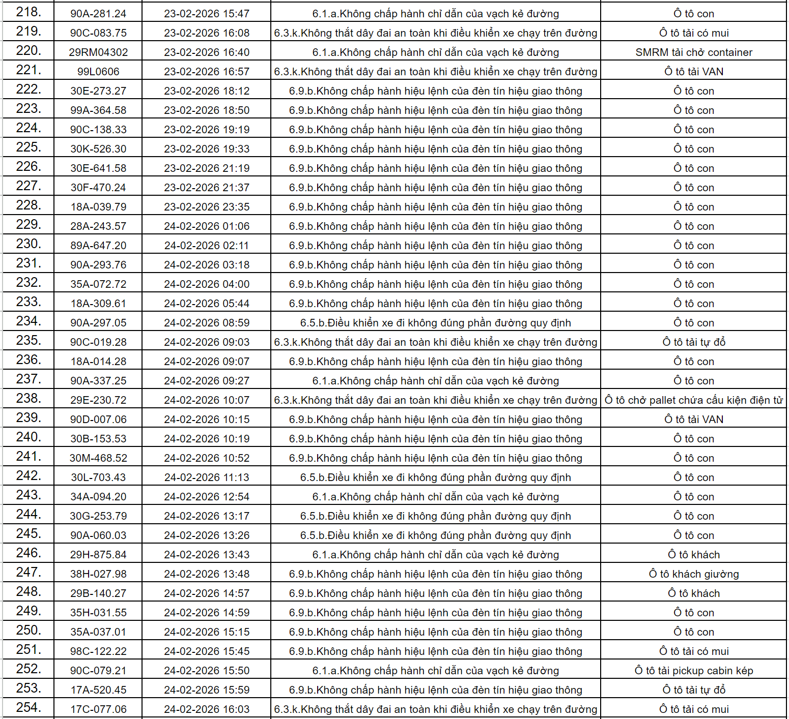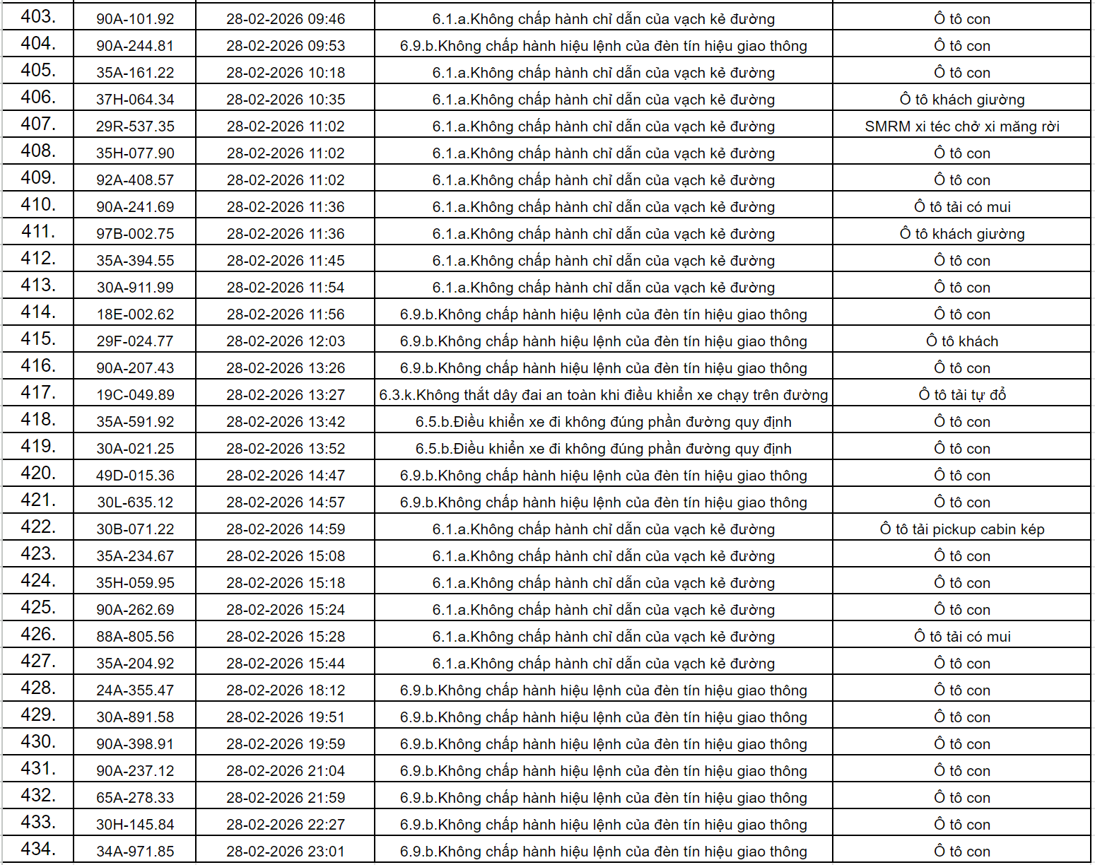 Theo thông báo của Phòng Cảnh sát giao thông Công an tỉnh Ninh Bình, từ ngày 18/2/2026 đến 28/2/2026 đã phát hiện 434 trường hợp phương tiện vi phạm trật tự an toàn giao thông qua hệ thống camera giám sát giao thông và phương tiện thiết bị kỹ thuật nghiệp vụ. Trong đó, phần lớn là lỗi không chấp hành hiệu lệnh của đèn tín hiệu giao thông. Danh sách cụ thể như sau: