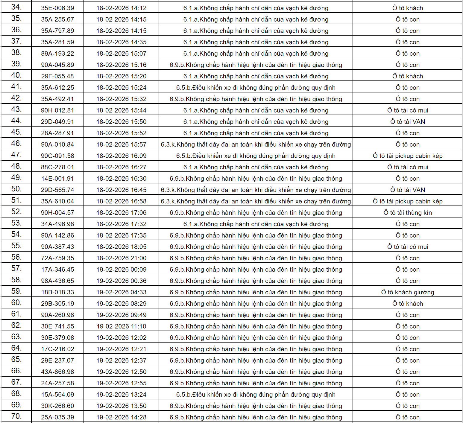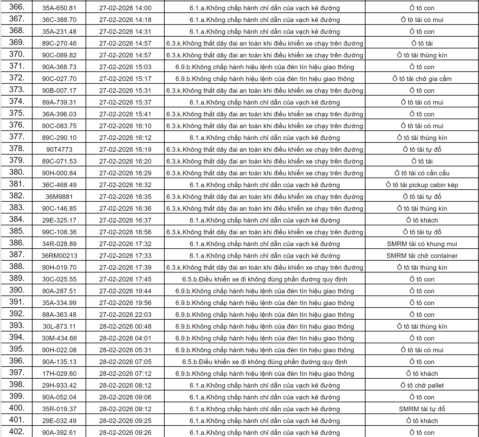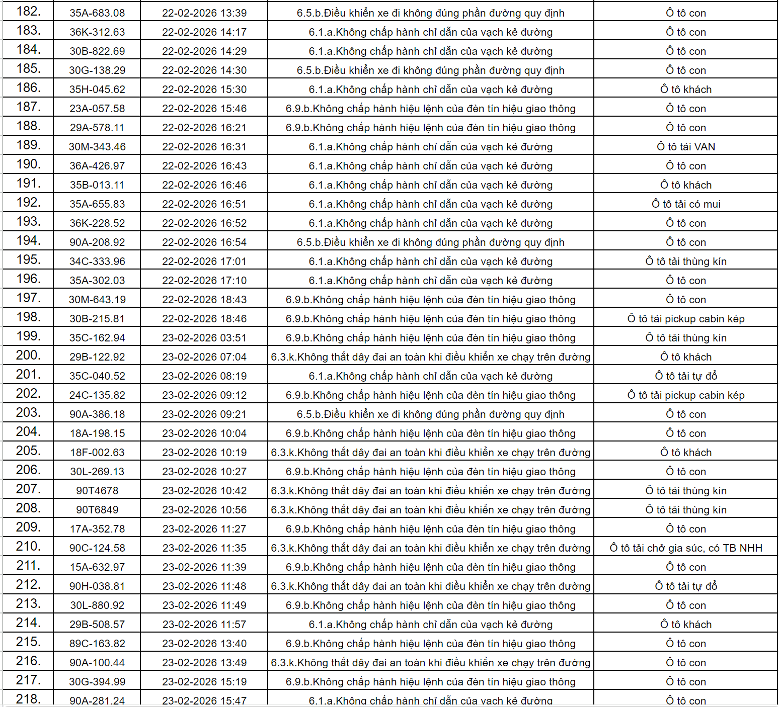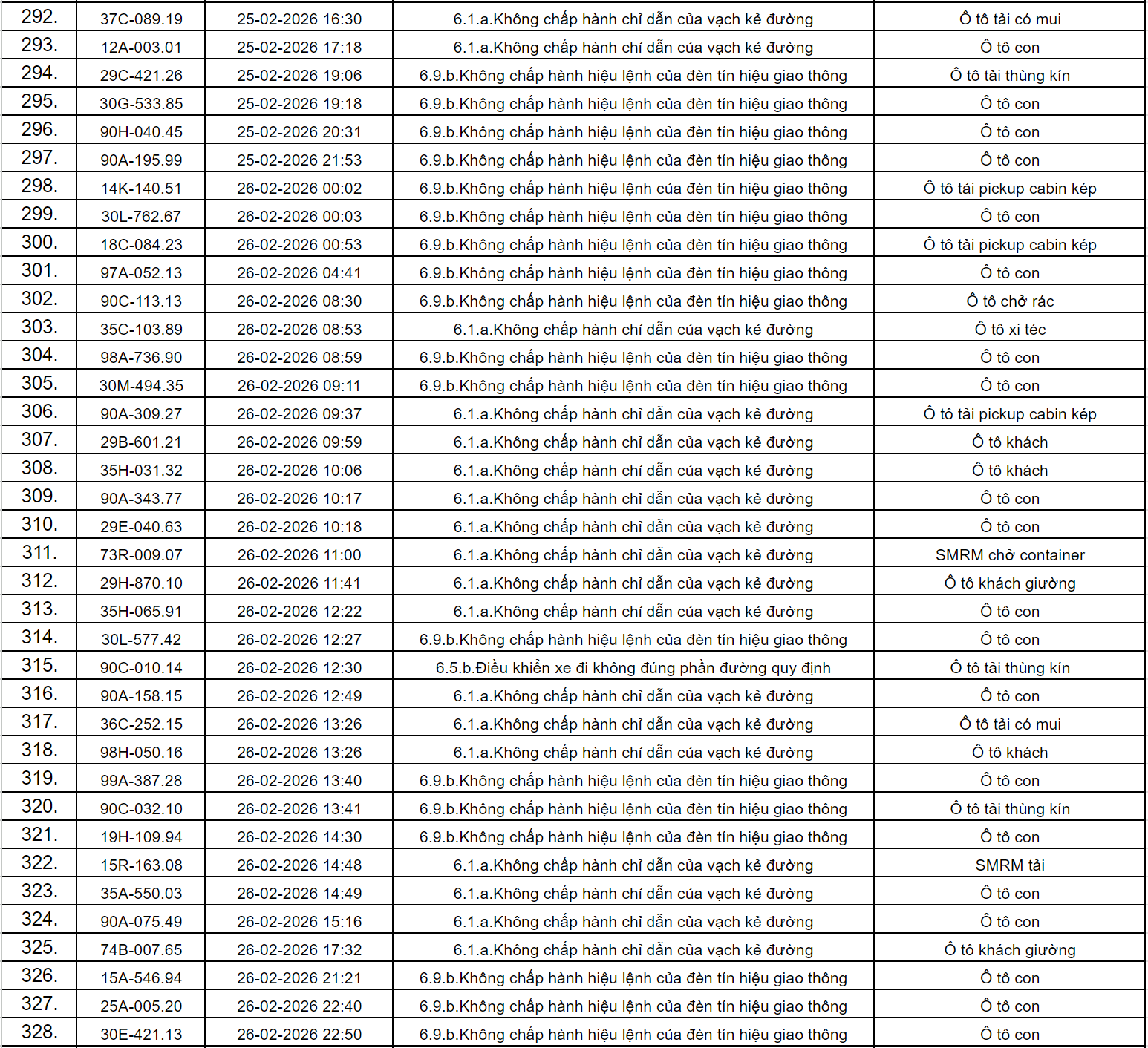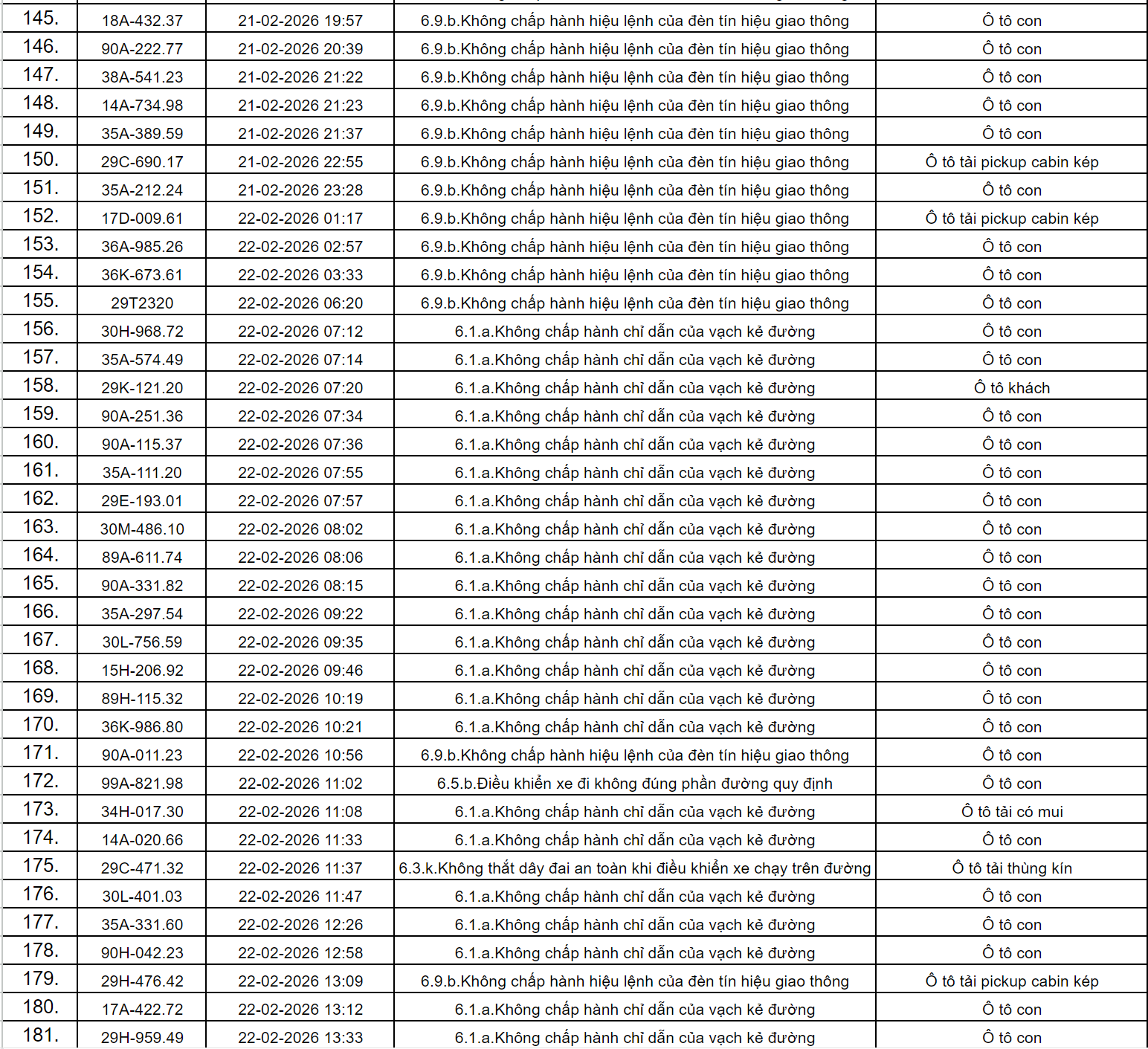 Theo thông báo của Phòng Cảnh sát giao thông Công an tỉnh Ninh Bình, từ ngày 18/2/2026 đến 28/2/2026 đã phát hiện 434 trường hợp phương tiện vi phạm trật tự an toàn giao thông qua hệ thống camera giám sát giao thông và phương tiện thiết bị kỹ thuật nghiệp vụ. Trong đó, phần lớn là lỗi không chấp hành hiệu lệnh của đèn tín hiệu giao thông. Danh sách cụ thể như sau: