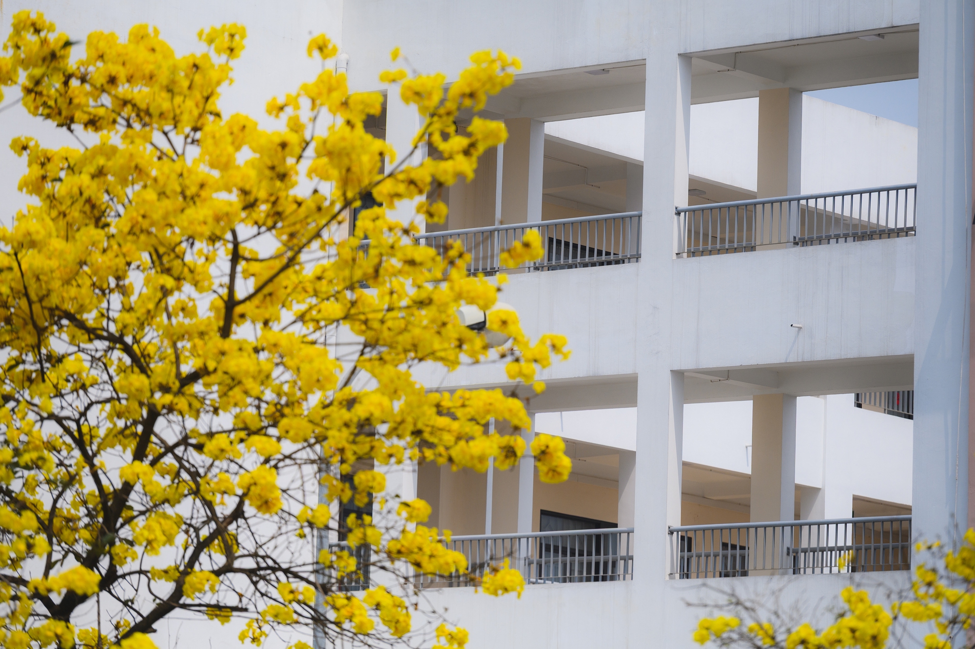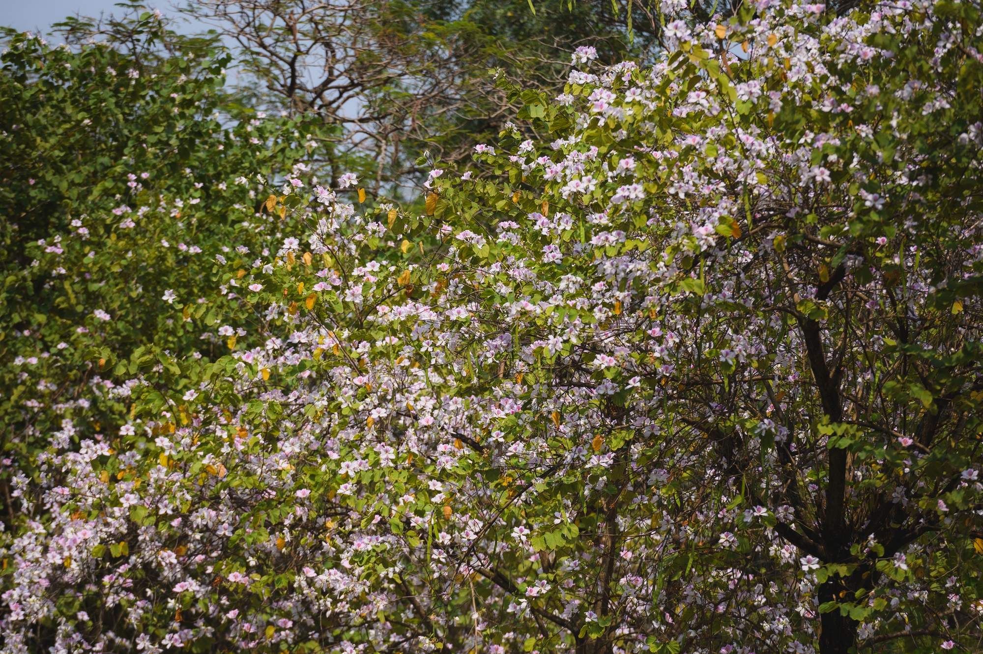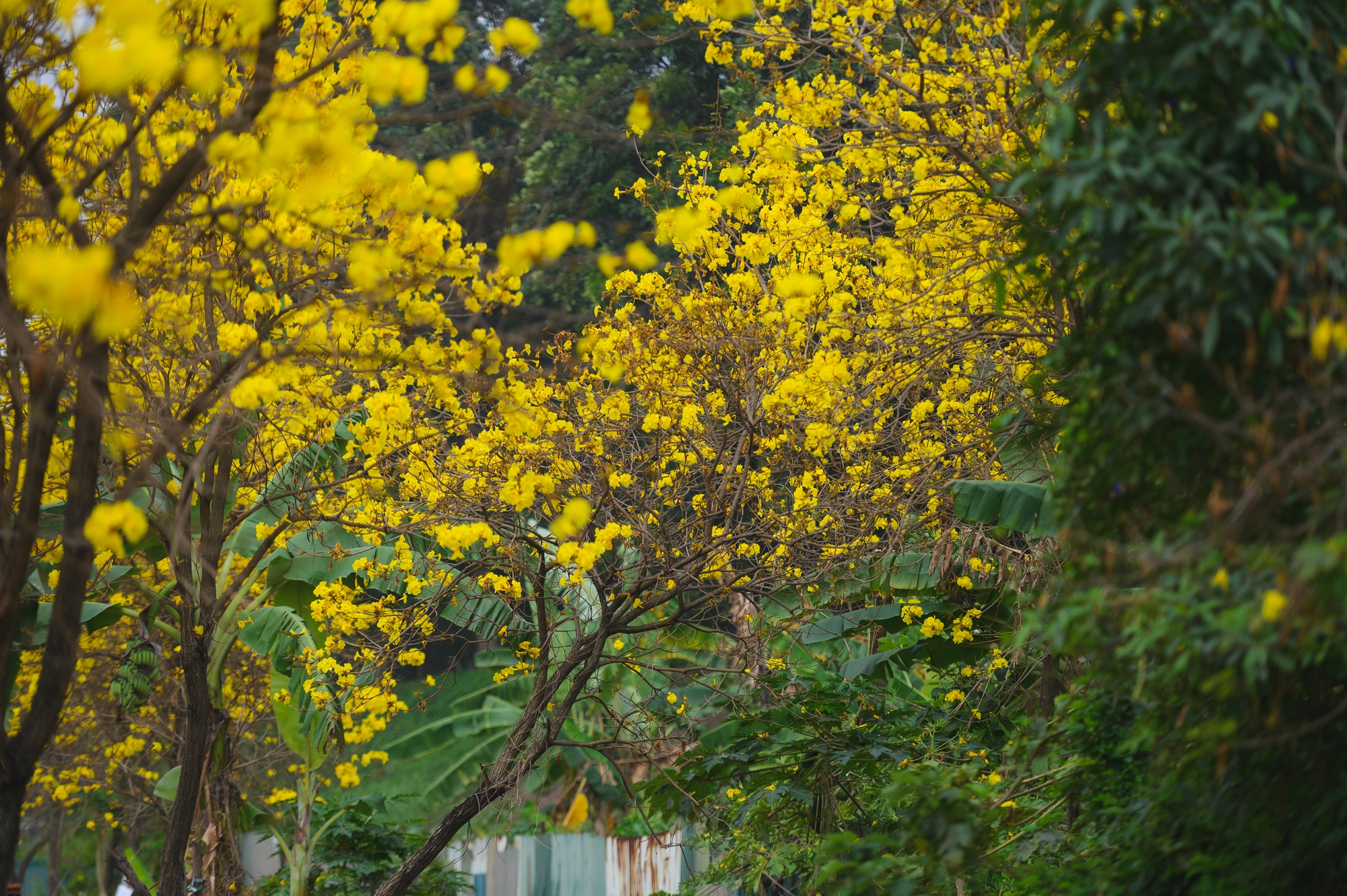 Lang thang dọc các con đường Hà Nội lúc này, thi thoảng lại bắt gặp một cây ban tím đã bắt đầu bung nở. Ở góc phố khác là sắc vàng rực rỡ của phong linh. Rồi đâu đó, những chùm hoa sưa trắng vẫn còn lác đác trên cành, mong manh và nhẹ bẫng trong gió. Thành phố như được phủ thêm một "lớp filter" dịu dàng của mùa xuân.