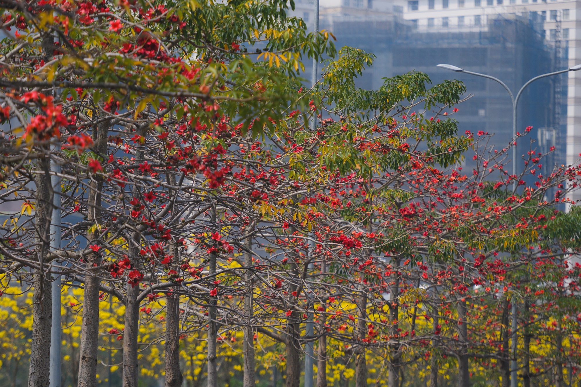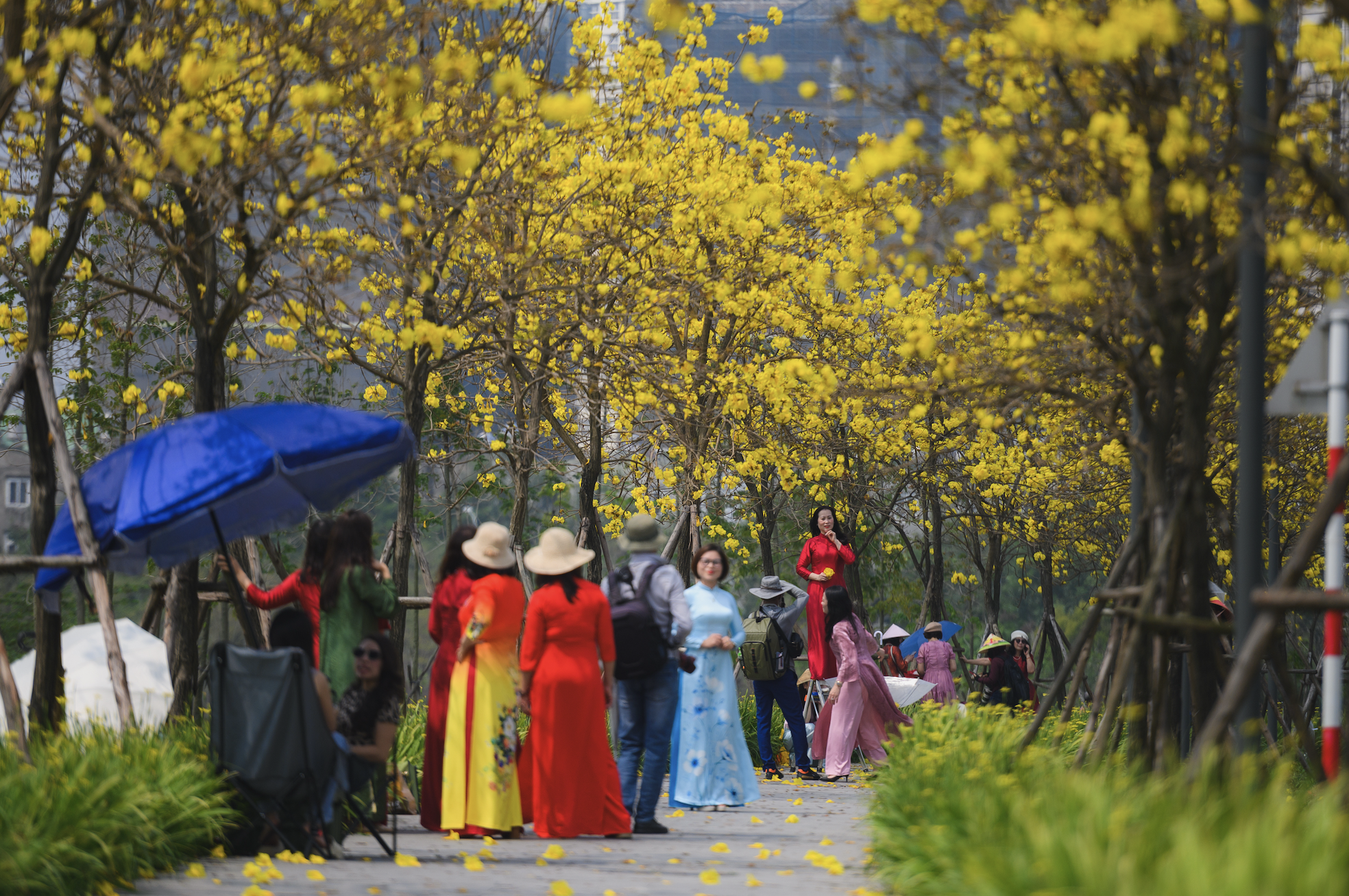 Khoảng vài năm trở lại đây, mùa xuân Hà Nội còn có thêm sự góp mặt của phong linh - loài hoa vàng rực rỡ. Lác đác trên vài tuyến phố trung tâm đã thấy những cây phong linh bung nở, nổi bật giữa nền trời xanh nhạt. Nhưng để chiêm ngưỡng cả một "vùng trời" vàng óng, nhiều người rủ nhau tới con đường hoa phong linh ở khu vực Hà Đông. Đây là nơi thu hút đông đảo dân tình đến chụp ảnh, lúc nào cũng trong không khí nhộn nhịp. Bên cạnh hoa phong linh, địa điểm này còn có hàng gạo đỏ cũng không kém phần rực rỡ.