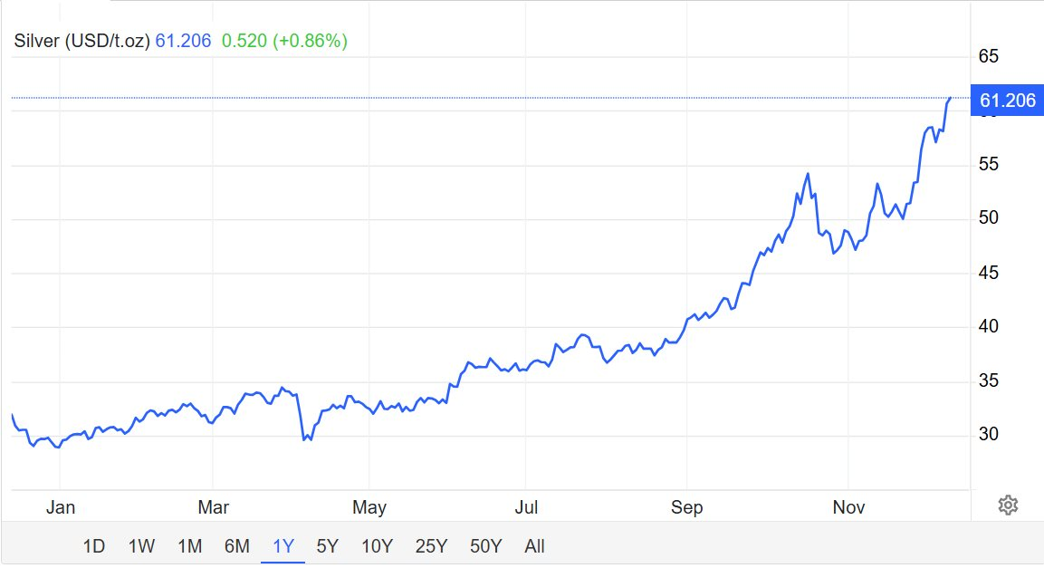 Trong phiên sáng ngày 10/12, giá bạc giao ngay đạt 61,2 USD/ounce, tăng 5% chỉ trong một ngày và cao hơn 100% so với đầu năm. Đà tăng ấn tượng này cũng khiến tỷ lệ vàng/bạc rơi xuống 69 điểm – mức thấp nhất kể từ tháng 7/2021 – cho thấy bạc đang vượt trội so với vàng một cách rõ rệt.