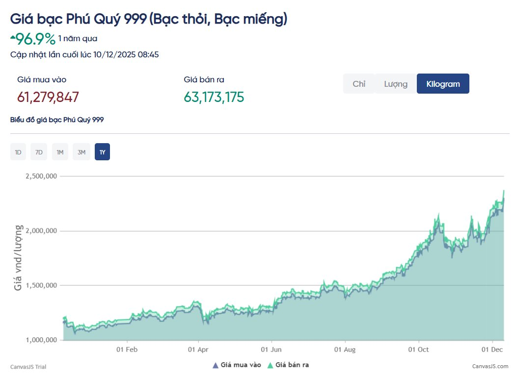 Tại thị trường Việt Nam, giá bạc cũng chứng kiến đà tăng mạnh mẽ, đạt mức đỉnh mới. Theo dữ liệu từ Tập đoàn Vàng bạc Đá quý Phú Quý, giá bạc thỏi 999 1kg có giá 61,279 triệu đồng/thỏi (mua vào) và 63,173 triệu đồng/thỏi (bán ra), cập nhật ngày 10/12. Tính từ đầu năm, giá bạc thỏi trong nước đã tăng mạnh hơn 110%, vượt xa mức tăng của giá vàng nhẫn (81%).