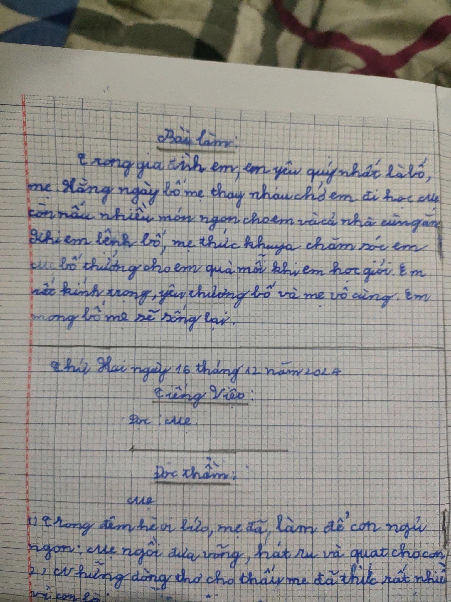 Em học sinh viết: "Trong gia đình, em yêu quý nhất là bố mẹ. Hằng ngày bố mẹ thay nhau chở em đi học. Mẹ còn nấu nhiều món ngon cho em và cả nhà cùng ăn. Khi em bệnh, bố mẹ thức khuya chăm sóc em. Mẹ bố thưởng cho em qùa mỗi khi em học giỏi. Em rất kính trọng yêu thương bố và mẹ vô cùng".