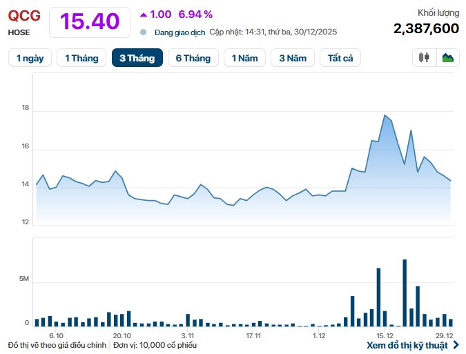 Giữa bối cảnh thị trường chứng khoán giao dịch giằng co, cổ phiếu QCG của Quốc Cường Gia Lai trở thành tâm điểm khi “cháy hàng”, thị giá tăng kịch trần lên 15.400 đồng/cp. Đà tăng bất ngờ xuất hiện sau khi QCG vừa trải qua chuỗi giảm sâu với nhiều phiên “lau sàn” và hiện thị giá vẫn thấp hơn khoảng 13% so với vùng đỉnh thiết lập vào giữa tháng 12.