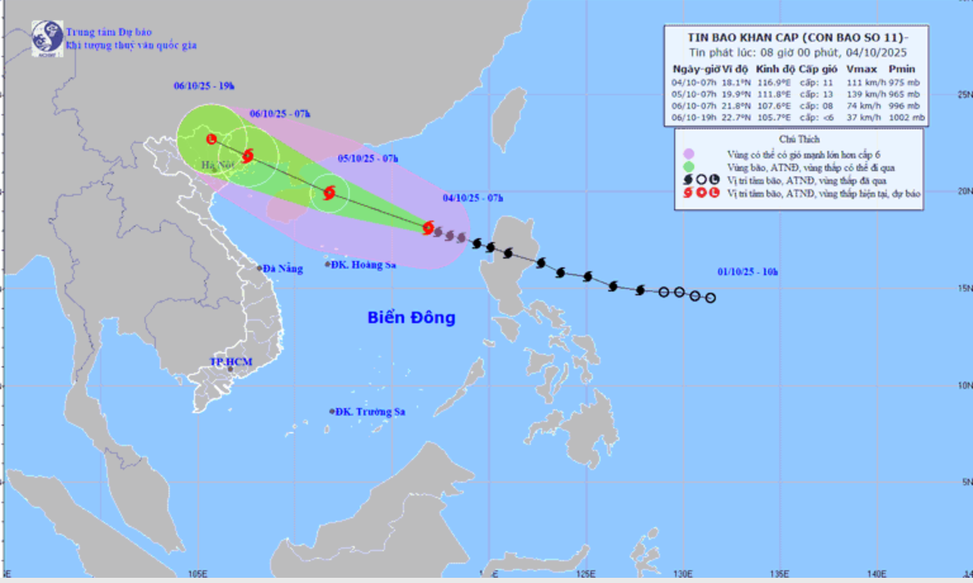 Theo dự báo, bão số 11 sẽ tiếp tục mạnh thêm lên cấp 12-13, giật cấp 15-16, di chuyển nhanh về phía bán đảo Lôi Châu và khu vực Vịnh Bắc Bộ. Trong ngày 5 - 07/10, bão sẽ ảnh hưởng trực tiếp đến Vịnh Bắc Bộ, ven biển và đất liền nước ta, tiếp tục gây mưa lớn tại khu vực Bắc Bộ và Thanh Hóa, Nghệ An.