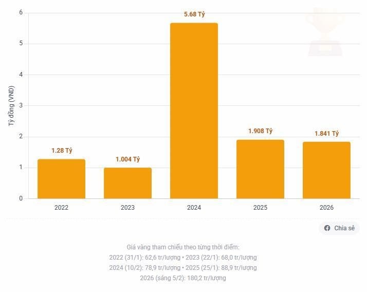 Năm 2026, mức thưởng cao nhất ghi nhận là 1,84 tỷ đồng tại TP.HCM. Tuy nhiên, năm nay do giá vàng tăng cao (~180 triệu đồng/lượng), mức thưởng 1,84 tỷ đồng chỉ tương đương khoảng 10,2 cây .