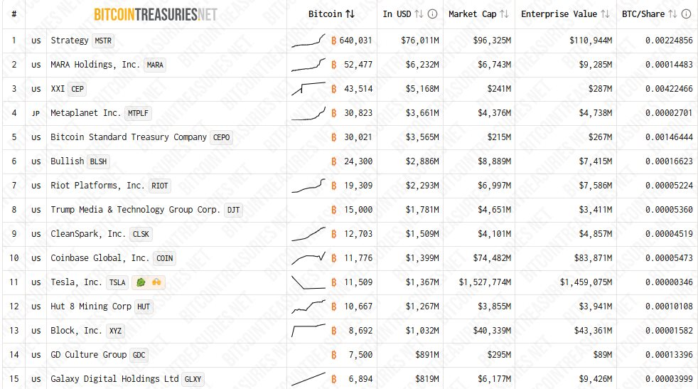 Đứng đầu danh sách này vẫn là Strategy, công ty này thậm chí liên tiếp mở rộng danh mục Bitcoin nhiều tuần gần đây, qua đó nâng lượng Bitcoin nắm giữ lên hơn 640.000 Bitcoin, bỏ xa các tên tuổi phía sau.