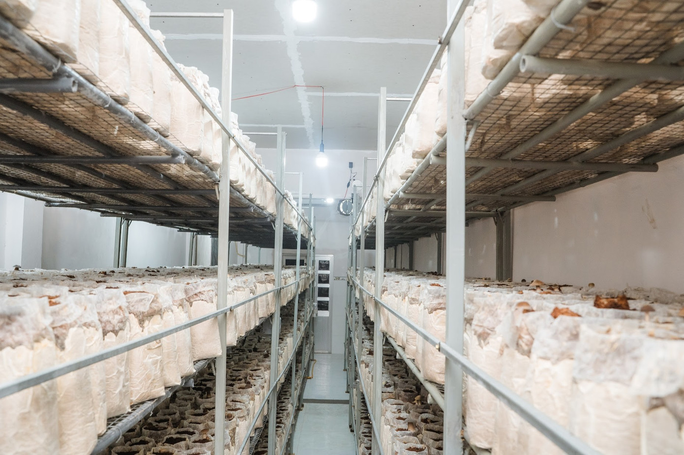 Theo anh Đạt, nấm mối đen phát triển tốt ở nhiệt độ 26 - 28°C, độ ẩm trên 85%. Hệ thống phun sương và quạt điều hòa tự động giúp duy trì điều kiện lý tưởng cho nấm quanh năm. Khi thông số biến động, thiết bị sẽ tự điều chỉnh, gần như không cần can thiệp thủ công.