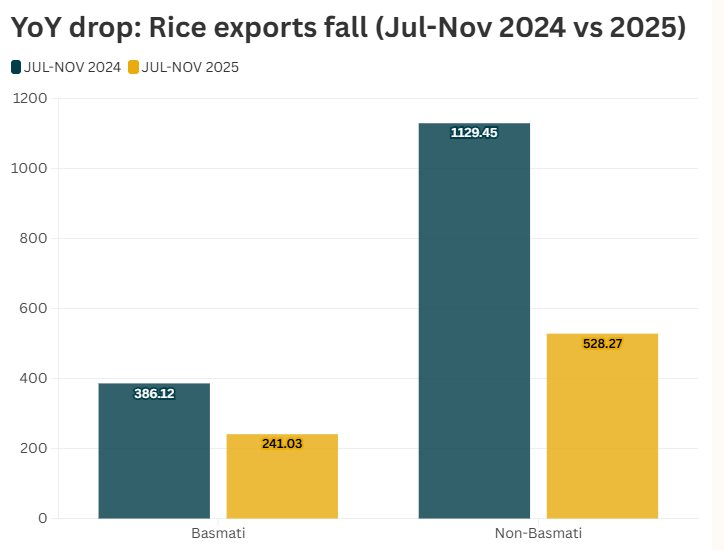 Theo số liệu của Cục Thống kê Pakistan (PBS), trong giai đoạn từ tháng 7 đến tháng 11 năm tài chính 2025–2026, xuất khẩu gạo của Pakistan giảm 40,02% về khối lượng so với cùng kỳ năm trước. Trong đó, xuất khẩu gạo IRRI-6 và IRRI-9 (gạo không phải basmati) giảm 39,70%, còn xuất khẩu gạo basmati giảm 41,79%.
