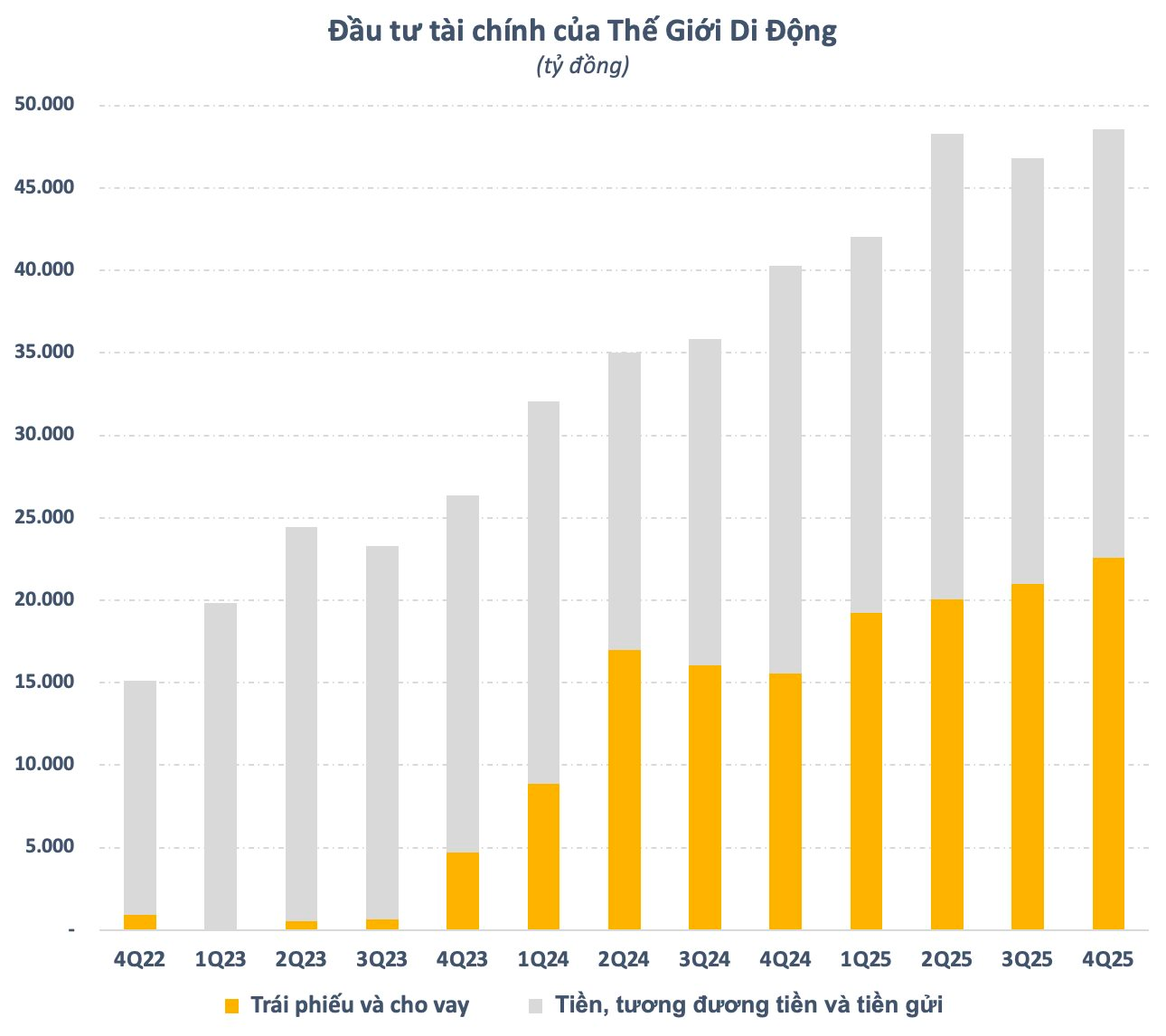 Doanh nghiệp của ông Nguyễn Đức Tài đẩy mạnh hoạt động đầu tư tài chính chủ yếu tập trung vào trái phiếu và cho vay. Tổng giá trị khoản mục đầu tư trái phiếu và phải thu từ cho vay của Thế Giới Di Động tăng quý thứ 4 liên tiếp lên gần 22.600 tỷ đồng vào cuối năm 2025, cao nhất từ trước đến nay. Chỉ riêng trong quý 4, con số này đã tăng khoảng 1.600 tỷ.