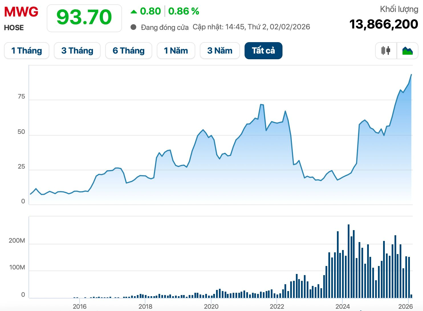 Trên nền tảng kết quả kinh doanh tăng trưởng ấn tượng, cổ phiếu MWG đang có nhịp bứt phá mạnh và hiện đang dừng ở mức cao nhất lịch sử 93.700 đồng/cp (tính theo giá điều chỉnh). Vốn hóa thị trường của Thế Giới Di Động cũng theo đó lập kỷ lục gần 138.000 tỷ đồng, tăng 60% sau một năm.