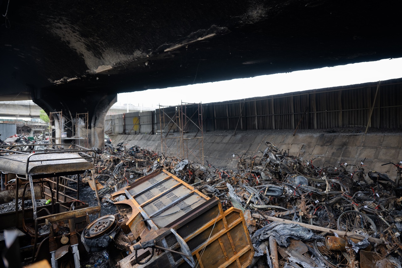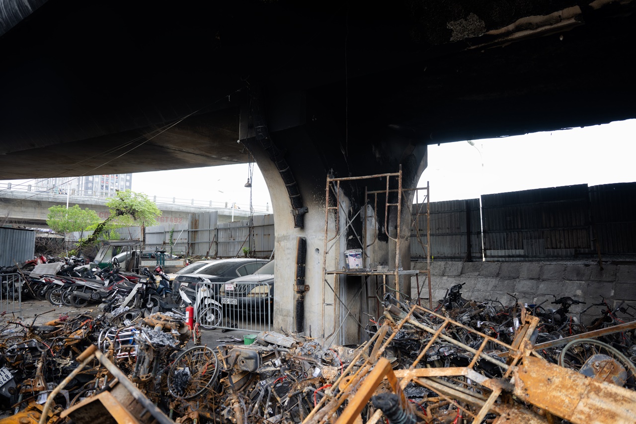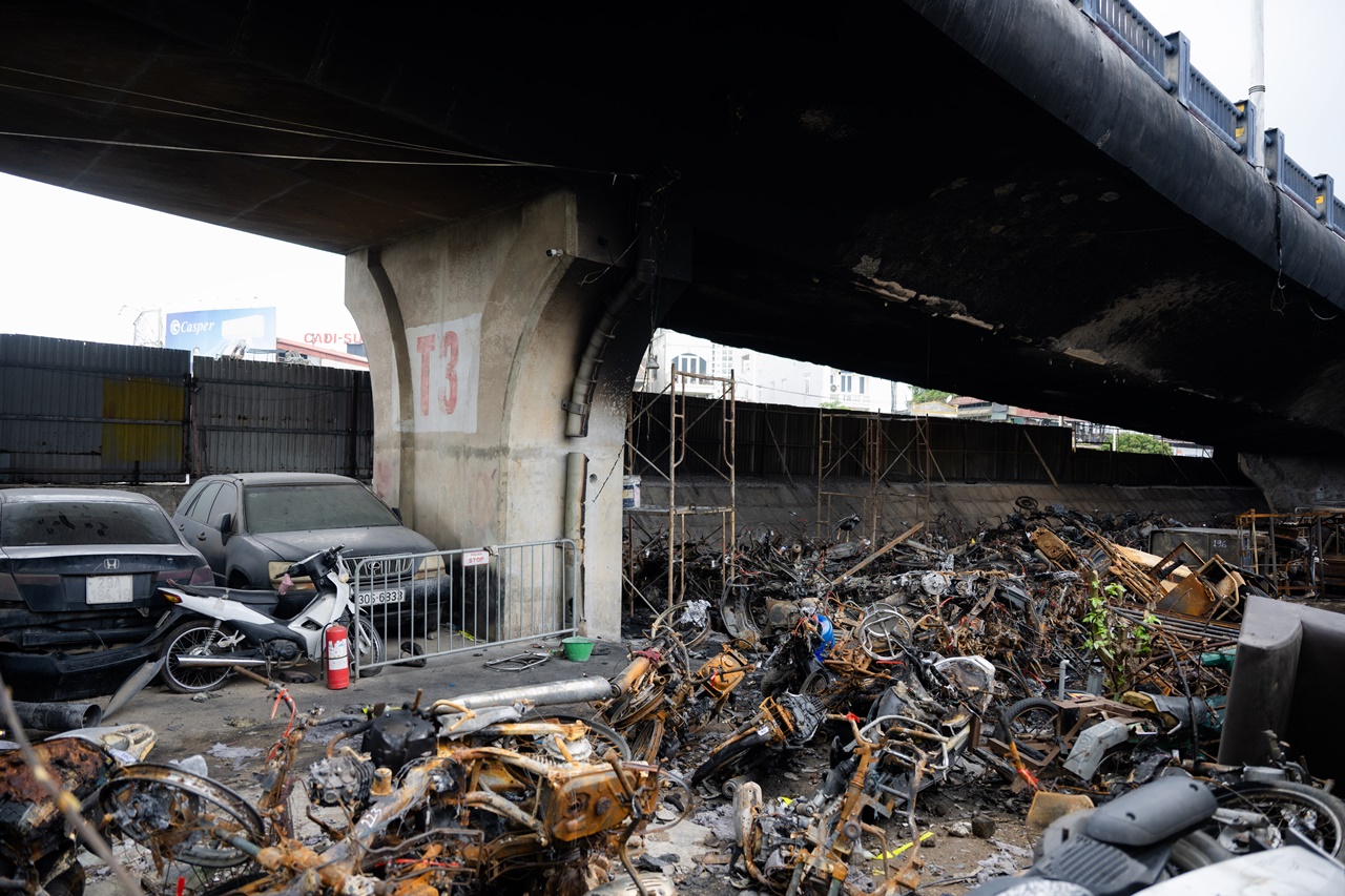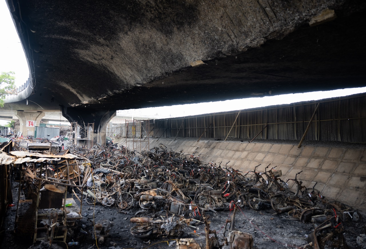 Nhiều ngày đã trôi qua kể từ vụ cháy kinh hoàng 500 xe máy tối 30/8 tại bãi trông giữ xe vi phạm dưới gầm cầu Vĩnh Tuy (đoạn nhánh Ramp CV1C, hướng từ Vĩnh Tuy xuống đê Nguyễn Khoái, phường Hồng Hà, quận Long Biên), hiện trường vẫn cho thấy mức độ thiệt hại nghiêm trọng