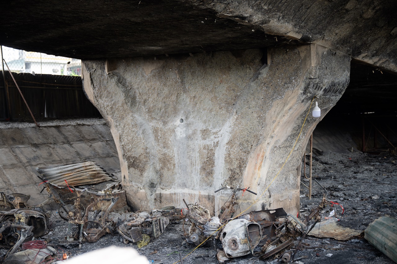 Phần trụ cầu nơi xảy ra cháy bị bám khói đen kịt, nhiều mảng bê tông bong tróc, để lộ cốt thép bên trong