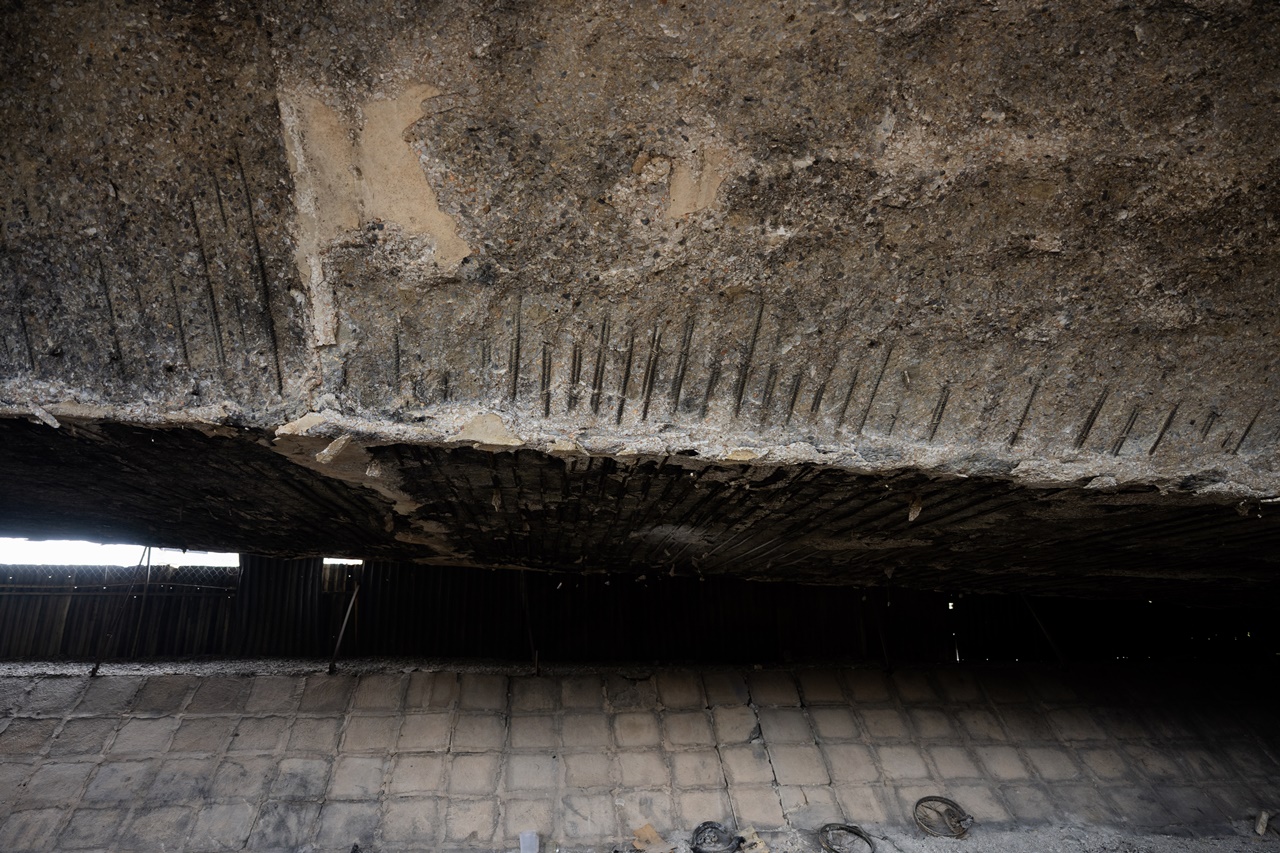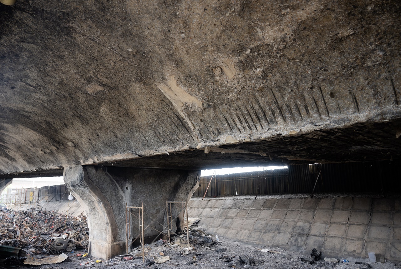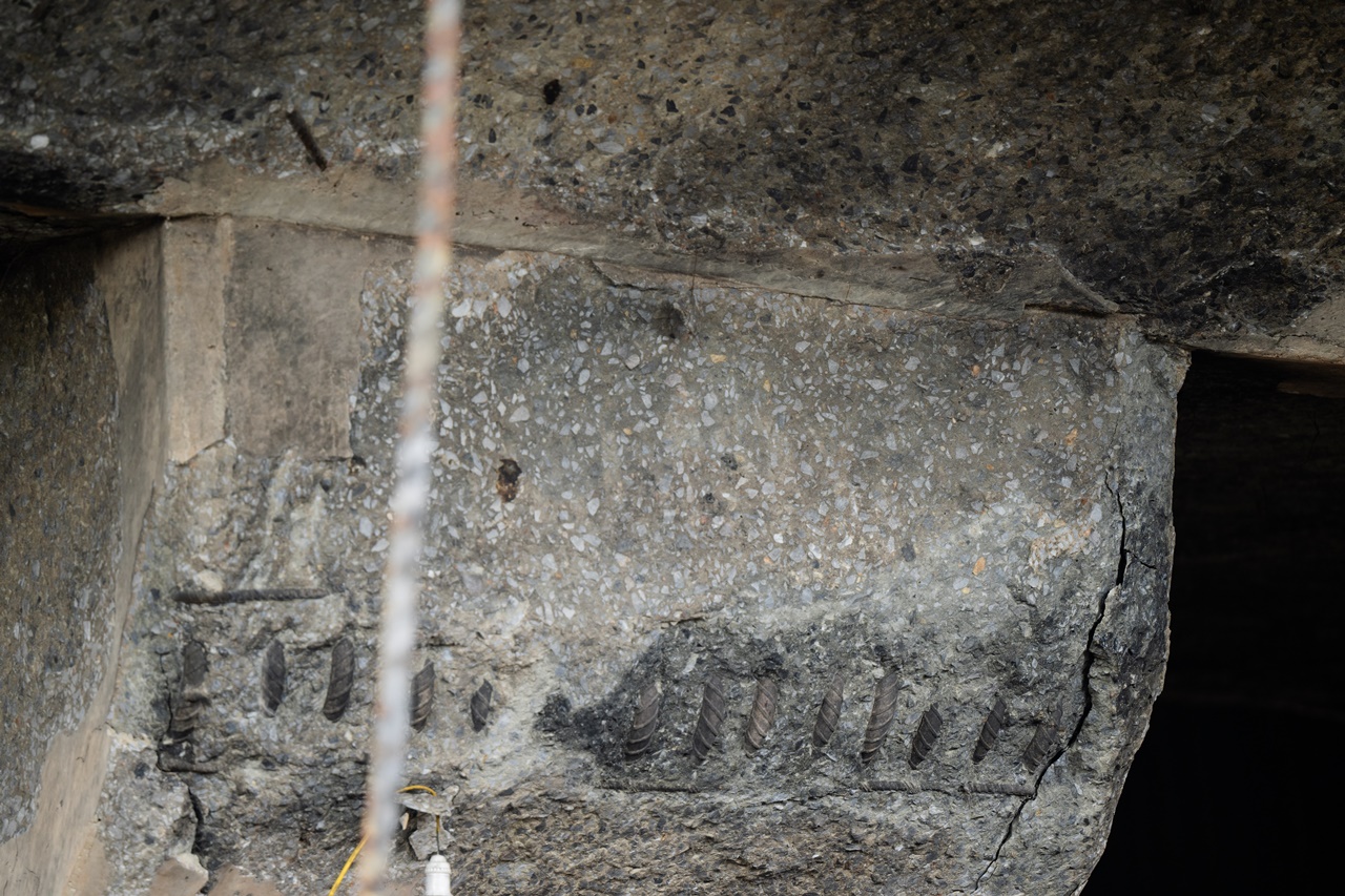 Tại một số vị trí, cốt thép đai ngang và thanh thép dọc đã hiện rõ sau khi lớp bê tông bảo vệ bị phá hủy bởi nhiệt độ cao