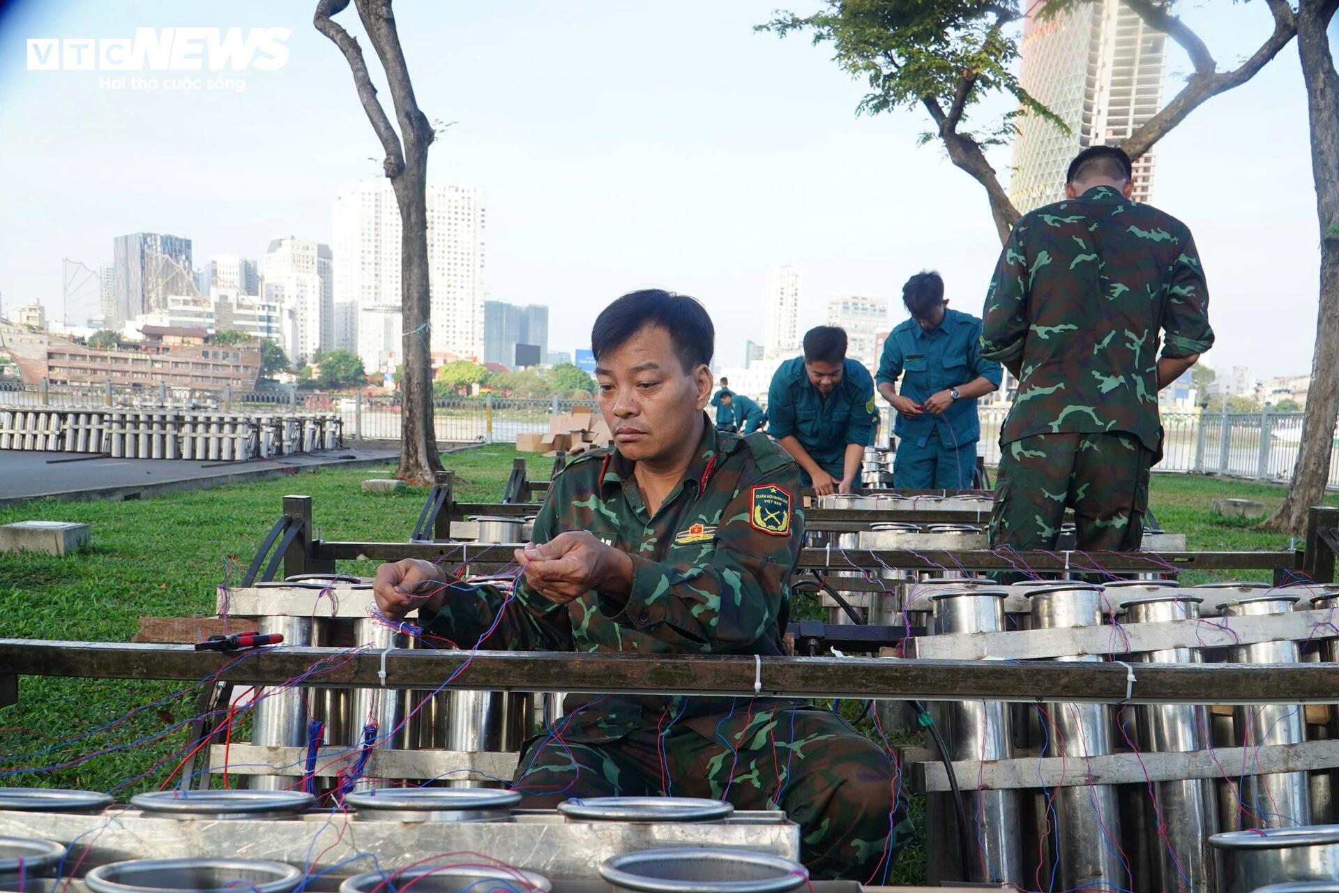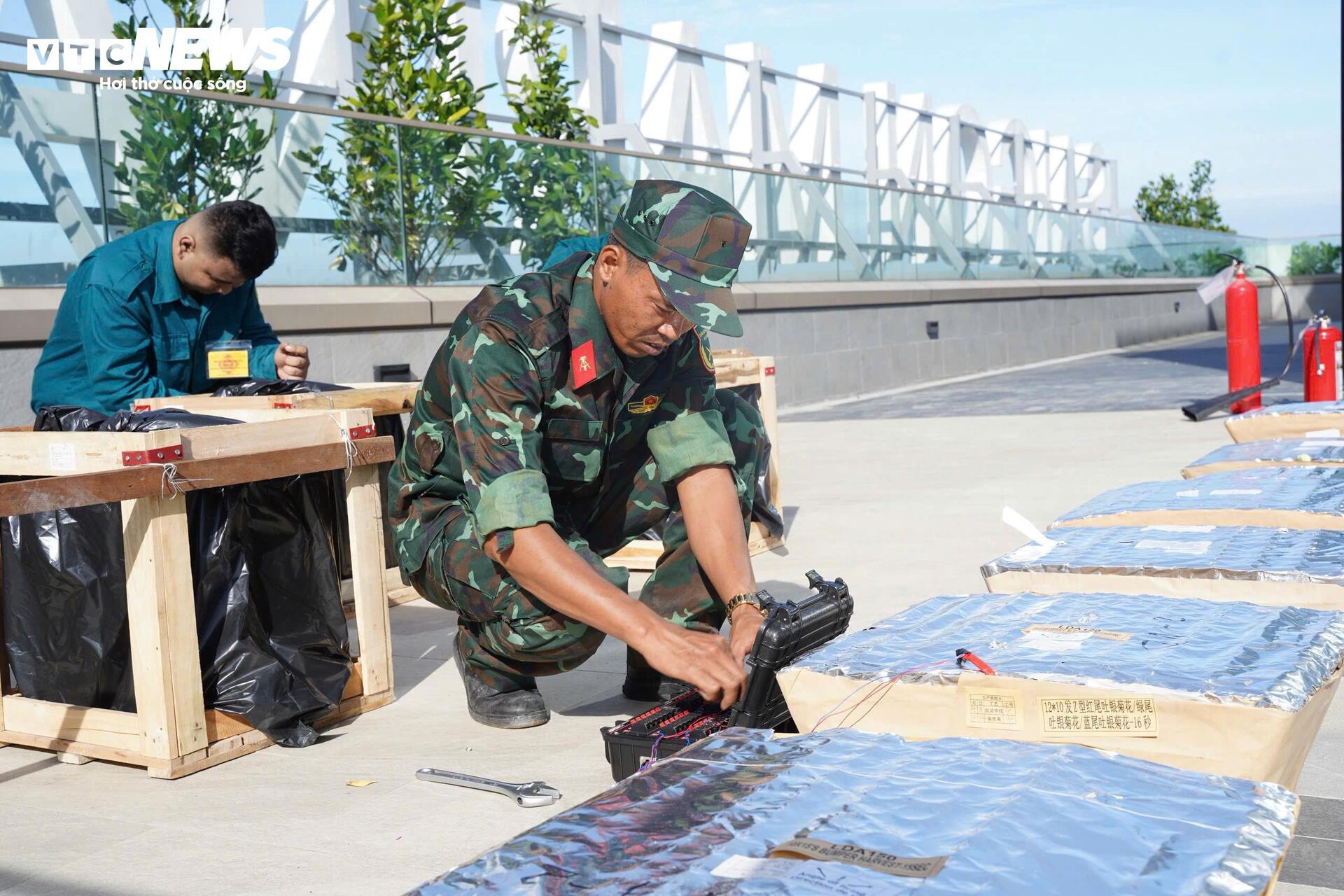 Hai ngày qua, lực lượng chức năng chuẩn bị cho hoạt động bắn pháo hoa theo quy trình nghiêm ngặt từ sắp xếp nòng pháo, đi dây điện đến đấu nối đạn vào giàn.