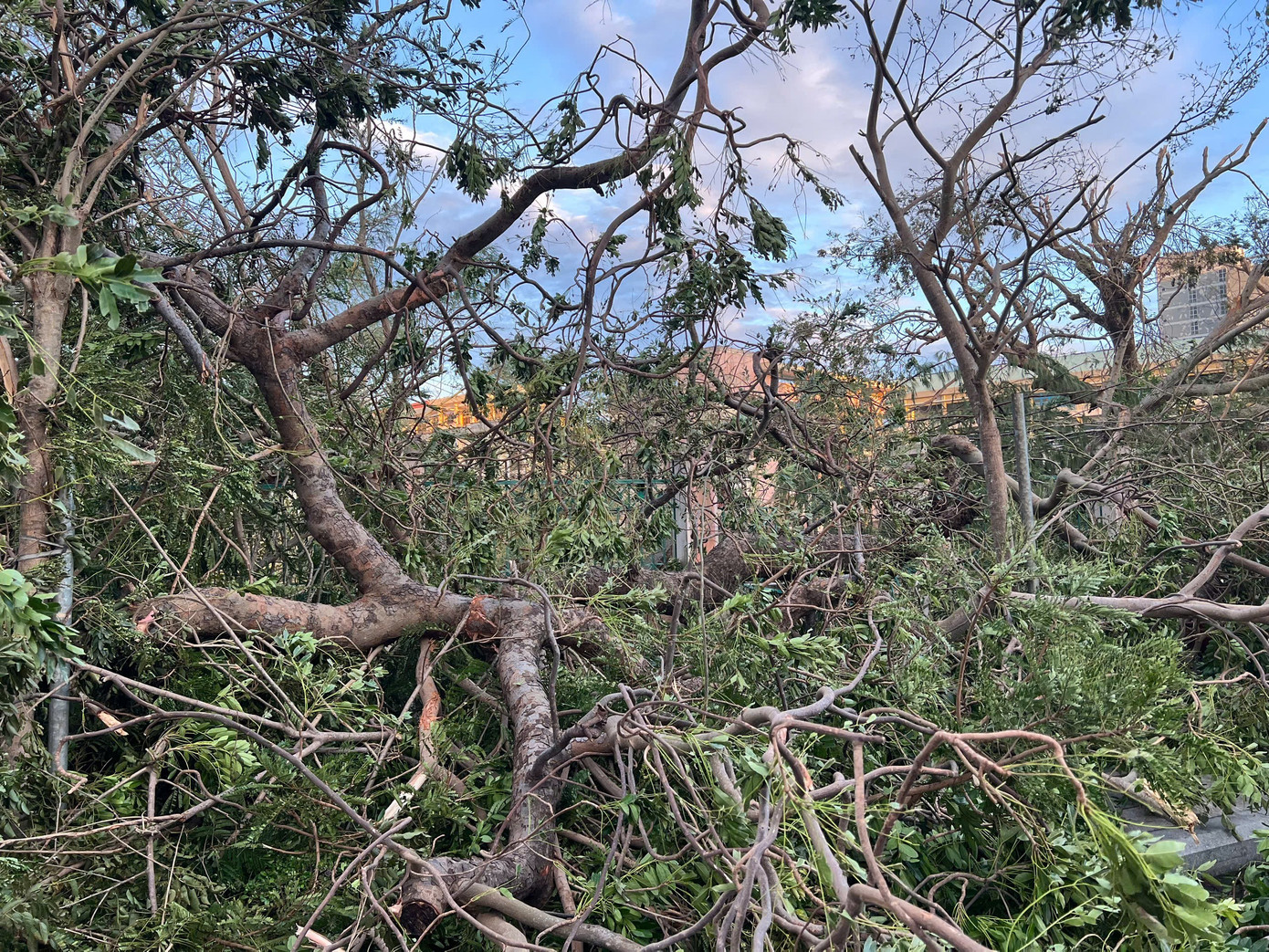 Cây cối trên hầu hết các nơi khu vực đông Gia Lai bị gãy đổ trước bão táp cấp 14.