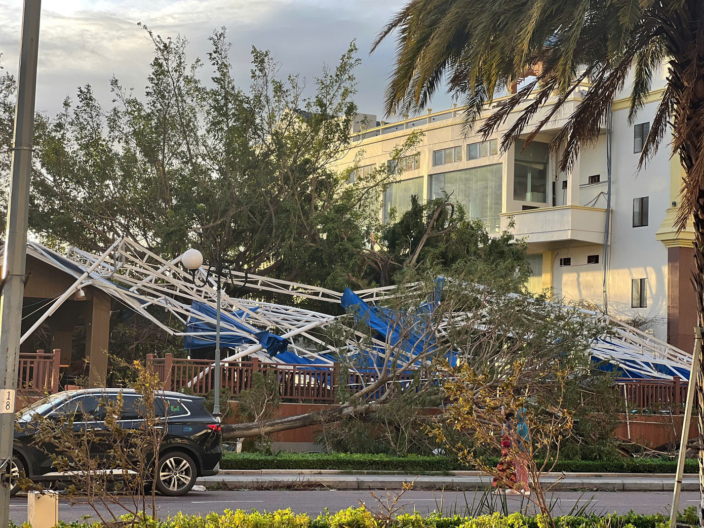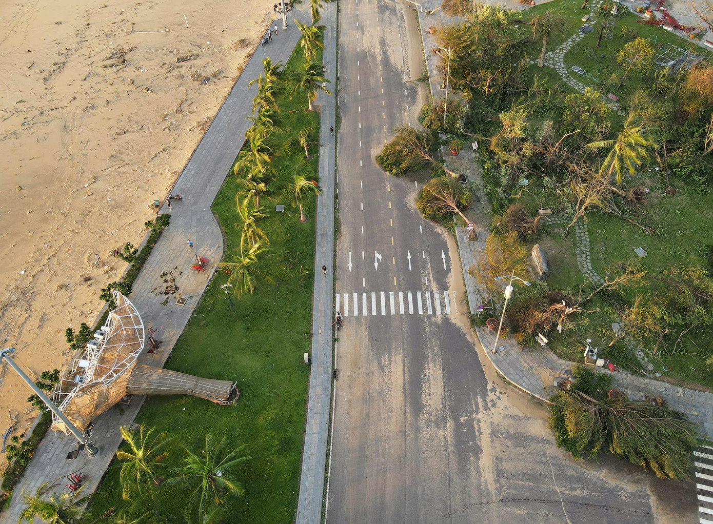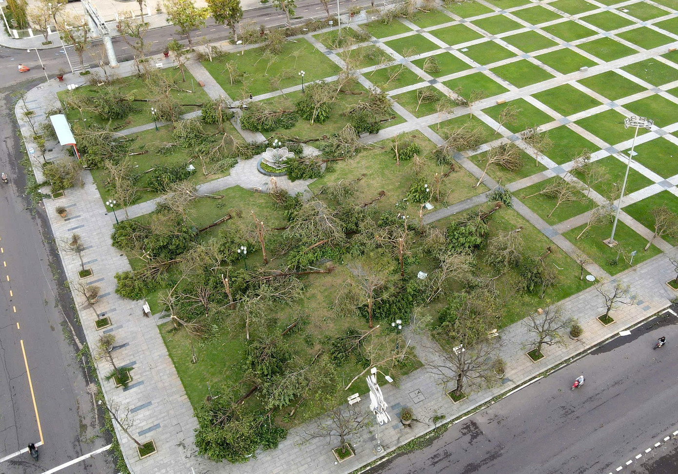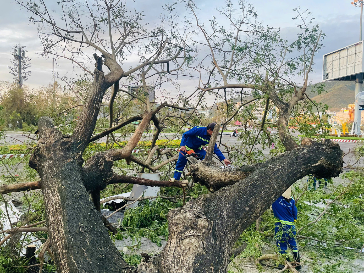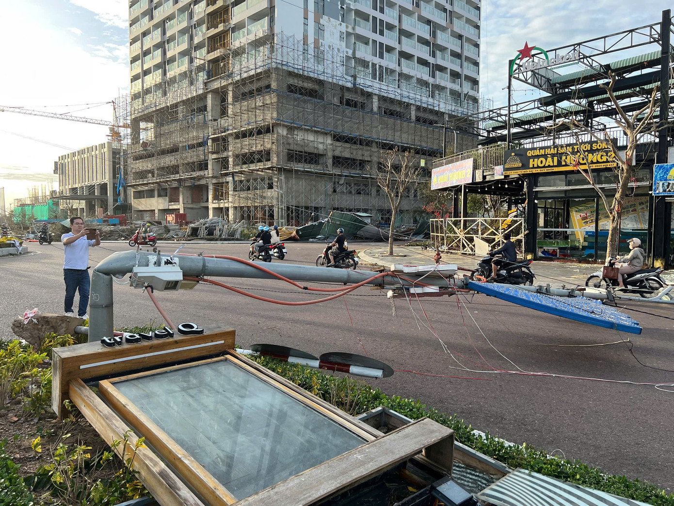 Rất nhiều cột đèn đường bị gãy rạp trước sức gió lớn từ cơn bão.