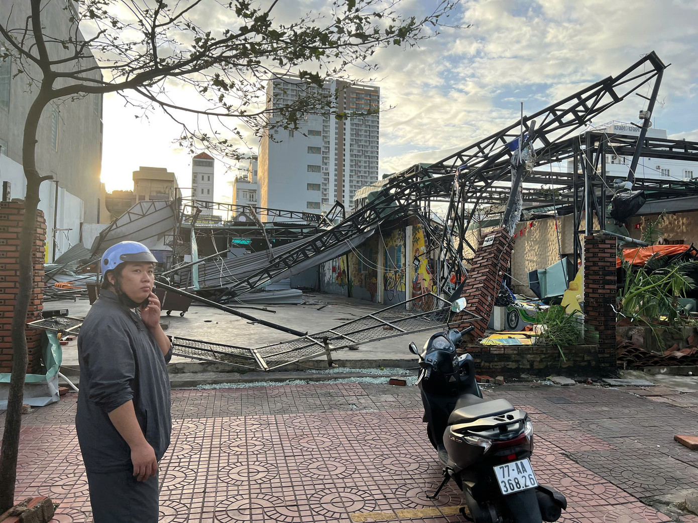Quán nhậu của anh Bũi Sỹ Cường (33 tuổi, số 232 đường Nguyễn Thị Định, phường Quy Nhơn Nam) bị tốc mái, sập gần như hoàn toàn. "Giờ tôi sẽ khắc phục, làm lại từ đầu. Dù gì quán cũng kinh doanh được 5 năm rồi", anh Cường lạc quan.