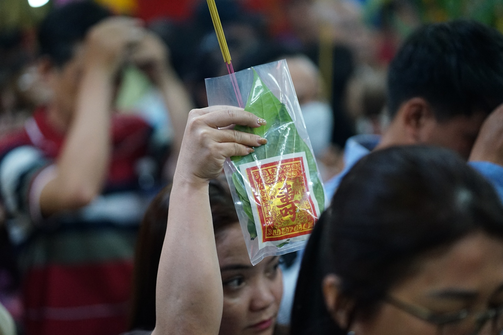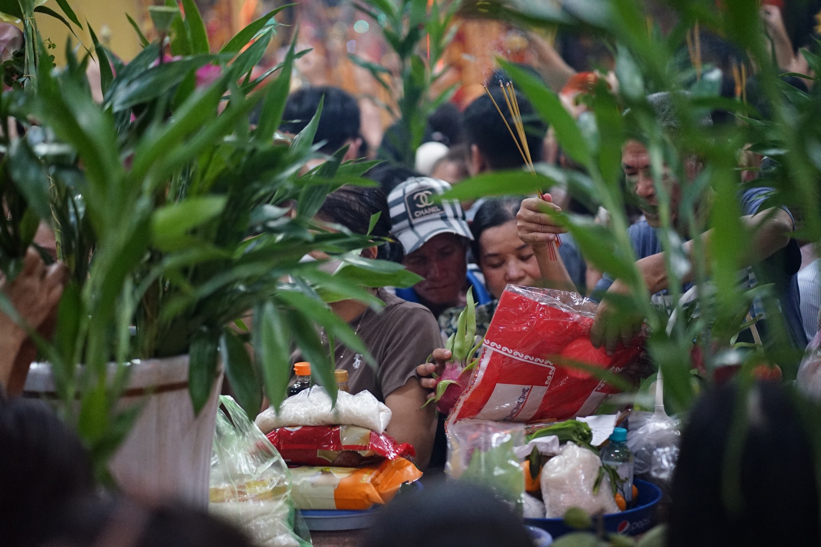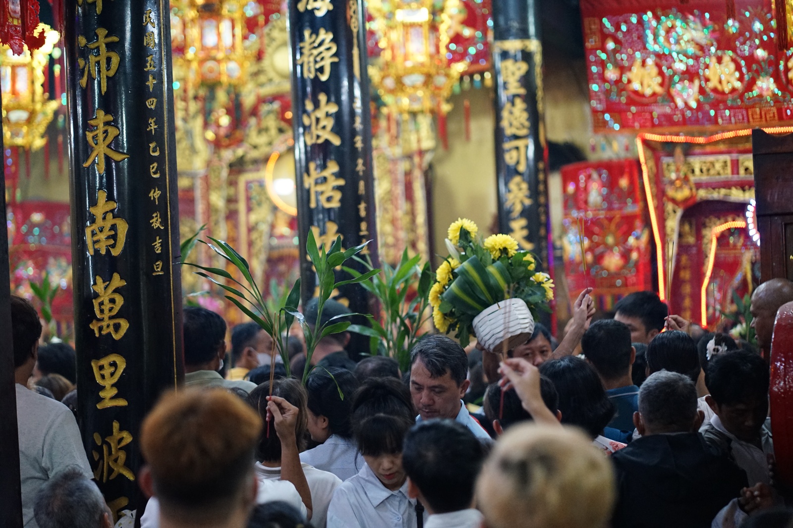 Mọi người cố gắng chen chân, giơ cao cành lộc và thẻ hưởng để di chuyển vào bên trong chánh điện