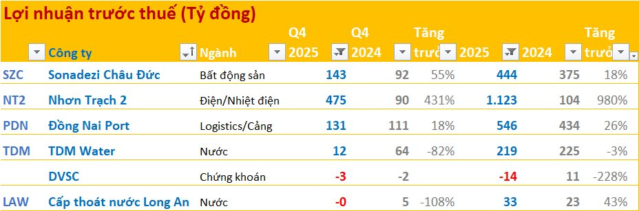 Tại nhóm bất động sản khu công nghiệp, Sonadezi Châu Đức (SZC) cũng ghi nhận một quý cuối năm khởi sắc với lợi nhuận đạt 143 tỷ đồng, tăng 55%. Tính chung cả năm 2025, SZC mang về 444 tỷ đồng lãi trước thuế, tăng trưởng 18%.