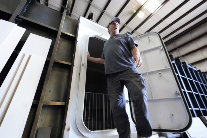 Ron Hubbard, chủ sở hữu của Atlas Survival Shelters, giới thiệu về hầm trú ẩn mà công ty ông đang xây dựng cho một khách hàng trong chuyến tham quan cơ sở sản xuất của mình tại Sulphur Springs, Texas. (Nguồn: AP)