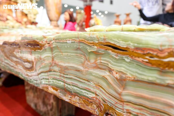 Bên cạnh bức tranh đá quý, bộ bàn trà chế tác nguyên khối từ đá onyx với giá 9 tỷ đồng cũng gây chú ý, trở thành điểm nhấn tại gian hàng.