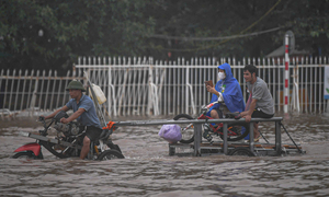 Theo ghi nhận, từ rạng sáng, khu vực quanh sân vận động Mỹ Đình (quận Nam Từ Liêm) - một trong những “điểm nóng” ngập úng - đã chìm trong biển nước. Cả vùng ngập mênh mông, nước dâng cao đến ngang hông người lớn, gió thổi mạnh kèm mưa lớn khiến khu vực này chẳng khác nào một vùng biển giữa lòng Thủ đô.