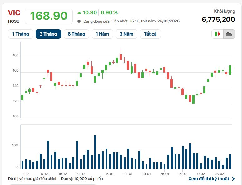 Cổ phiếu VIC tăng hết biên độ, dẫn dắt thị trường chứng khoán "thăng hoa" trong phiên 26/2.