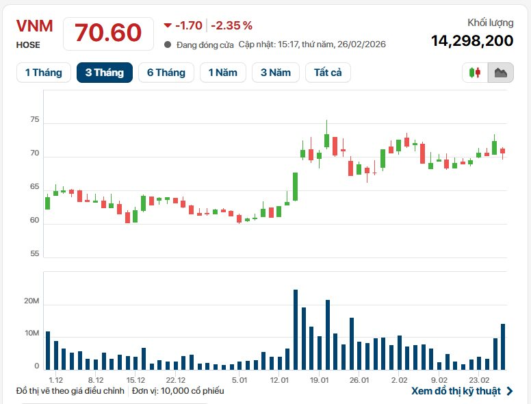 Cổ phiếu VNM bất ngờ bị khối ngoại "xả" đột biến hơn 2.100 tỷ đồng trong phiên 26/2.