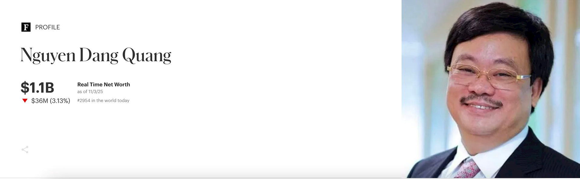 Theo bảng xếp hạng thời gian thực của Forbes, tính đến ngày 3/11, ông Quang hiện có khối tài sản 1,1 tỷ USD.
