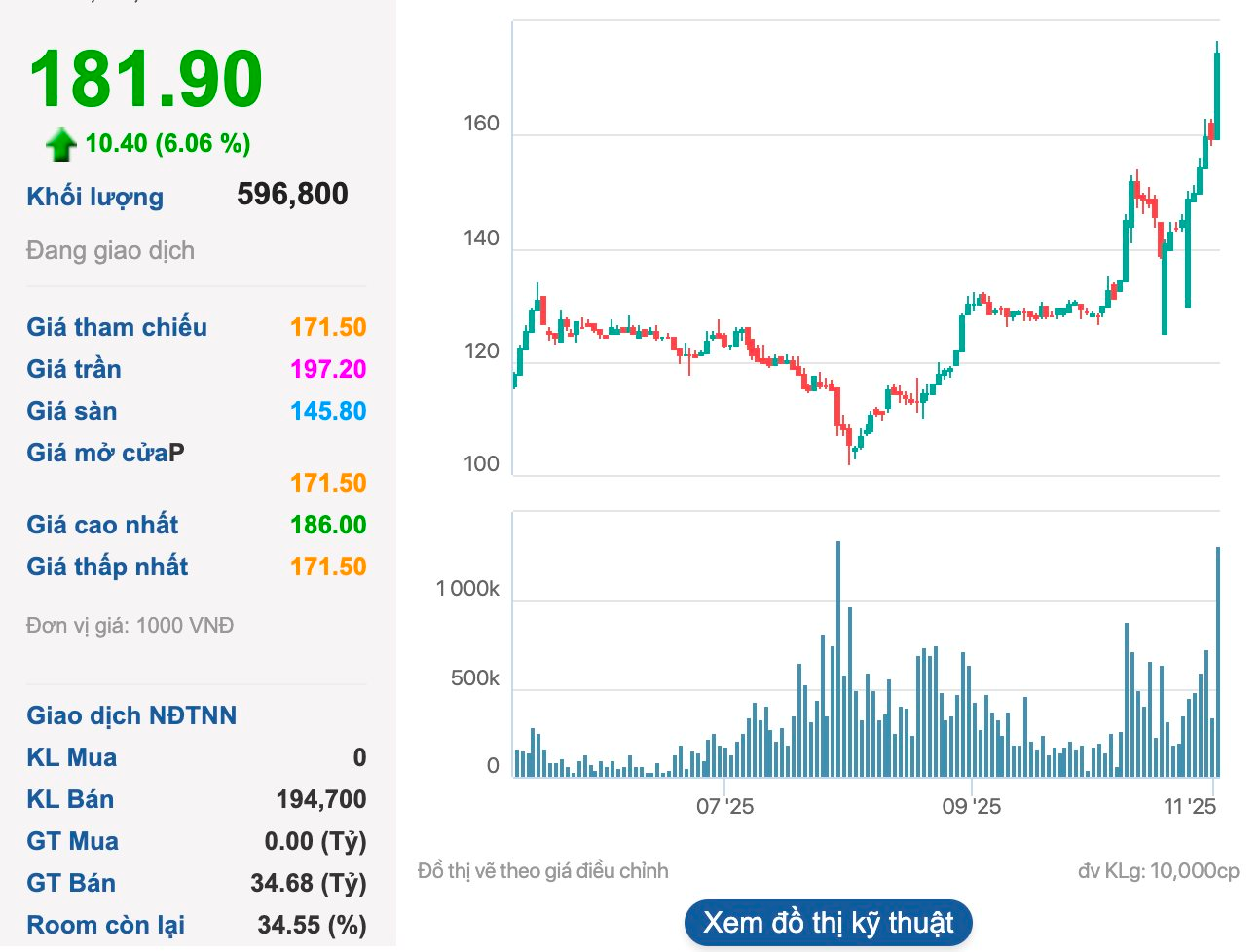 Phiên giao dịch sáng 4/11, cổ phiếu MCH của Công ty Cổ phần Hàng tiêu dùng Masan - Masan Consumer tiếp tục tăng mạnh, có thời điểm lên mức 181.900 đồng/cp, vượt qua lịch sử lập được hồi cuối năm 2024.