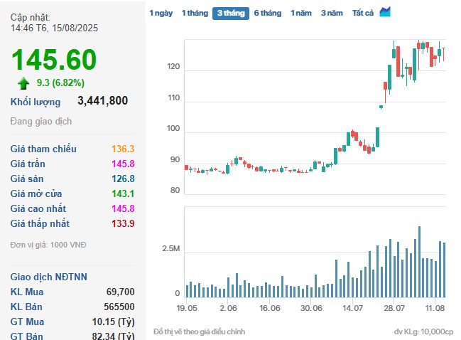 Kết phiên 15/8, giá cổ phiếu VJC ở 145.600 đồng/cổ phiếu, tăng “bốc đầu” 6,82% so với phiên trước, khối lượng cổ phiếu giao dịch khớp lệnh đạt hơn 3,4 triệu đơn vị - tăng nhẹ so với phiên trước.