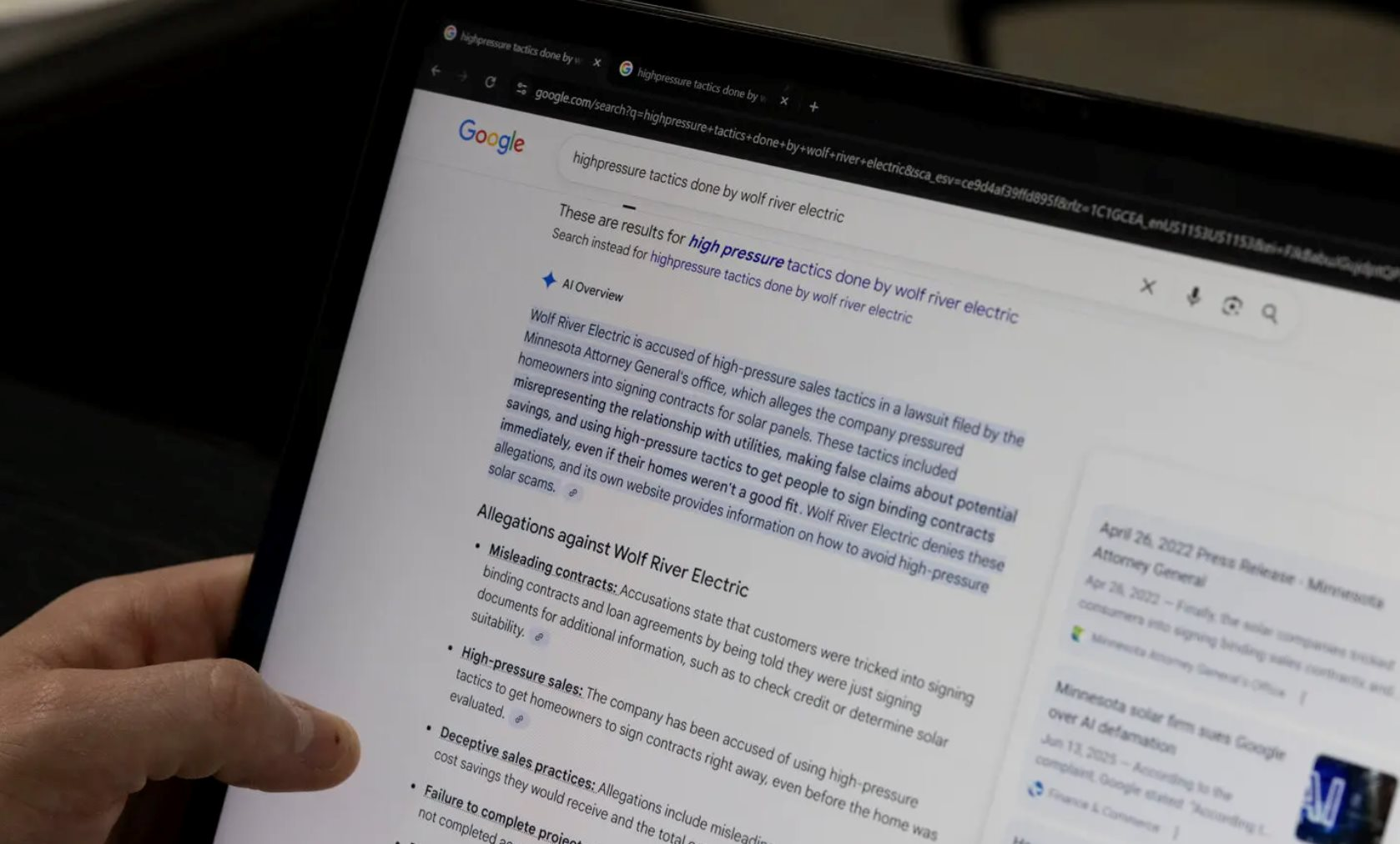 Khi gõ tên công ty lên Google, phần “AI Overview” – tính năng tổng hợp thông tin do trí tuệ nhân tạo của Google tạo ra – lại hiển thị một nội dung cho rằng Wolf River đang bị Tổng chưởng lý Minnesota kiện vì “lừa đảo khách hàng, che giấu phí và ép ký hợp đồng”. Nhưng trên thực tế, công ty này không hề liên quan đến bất kỳ vụ kiện nào.