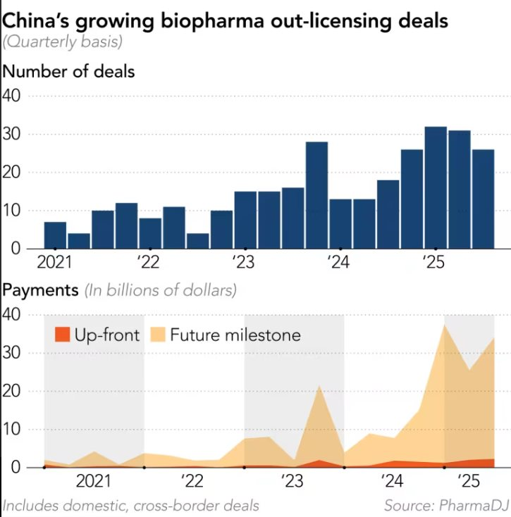 Ngoài ra, sự khát vốn và cạnh tranh đã thúc đẩy các công ty Trung Quốc bán quyền phát triển (out-licensing) cho đối tác phương Tây, tạo nên một mô hình kinh doanh mới: đổi sáng tạo lấy tiền mặt và uy tín. Nửa đầu năm 2025, các công ty Trung Quốc đã công bố 48 thương vụ bản quyền xuyên biên giới, trị giá 2,6 tỷ USD tiền mặt, có thể lên tới 31 tỷ USD nếu đạt mốc thành công.