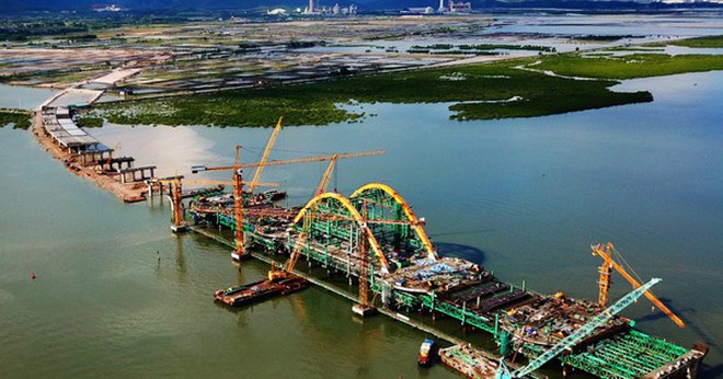 Giải thích: Đây là cầu 6 làn xe đầu tiên của Quảng Ninh, nằm trong hệ thống cầu bắc qua vịnh Cửa Lục với tổng mức đầu tư trên 2.100 tỷ đồng. Thiết kế rộng 33,1m sử dụng bê-tông cốt thép dự ứng lực, đảm bảo tĩnh không thông thuyền 40x7m, cho phép tàu thuyền lớn di chuyển dễ dàng dưới cầu mà không ảnh hưởng đến giao thông đường bộ.