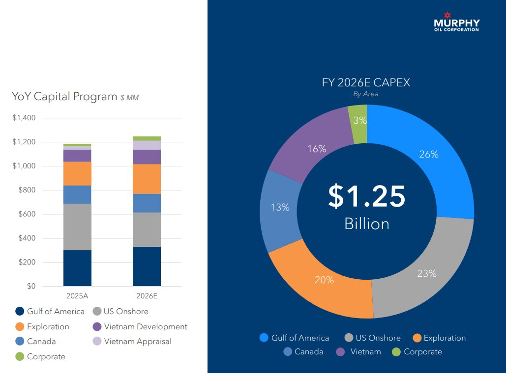Ngày 29/1, Murphy Oil tổng kết hoạt động năm 2025 và nhìn nhận năm 2026. Riêng về đầu tư (capital expenditure) trong năm 2026, doanh nghiệp cho biết sẽ dành cho cả năm là 1,25 tỷ USD, trong đó, cho riêng Việt Nam là 195 triệu USD, tương đương 16%.