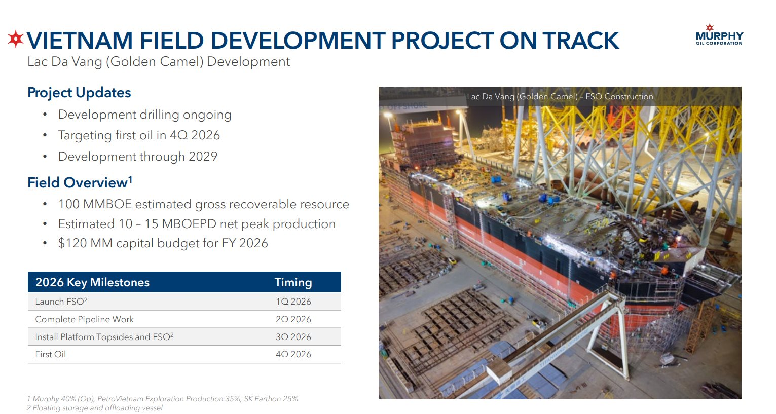 Về hoạt động hiện tại, Murphy Oil cho biết dự án Lạc Đà Vàng (Golden Camel) đã lắp đặt chân đế giàn khoan và đang tiến hành khoan phát triển, hướng tới có dòng dầu đầu tiên (first oil) vào quý 4/2026. Dự án này có quy mô khoảng 100 triệu thùng (Million Barrels of Oil Equivalent-MMBOE).