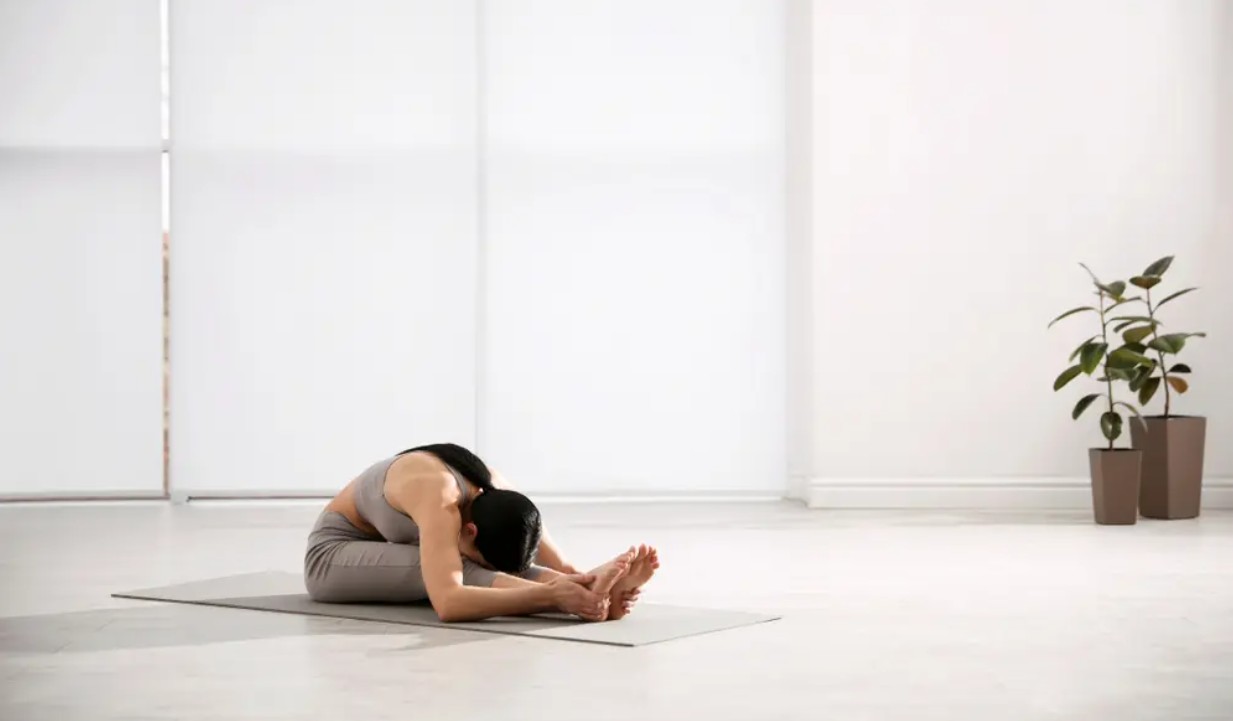 Cách thực hiện: Ngồi thẳng lưng trên thảm, hai chân duỗi thẳng phía trước. Giơ hai tay lên cao qua đầu, ngón tay hướng lên trần nhà, hít vào - kéo dài cột sống. Khi thở ra, bắt đầu cúi người về phía trước, tay ôm lấy bàn chân.