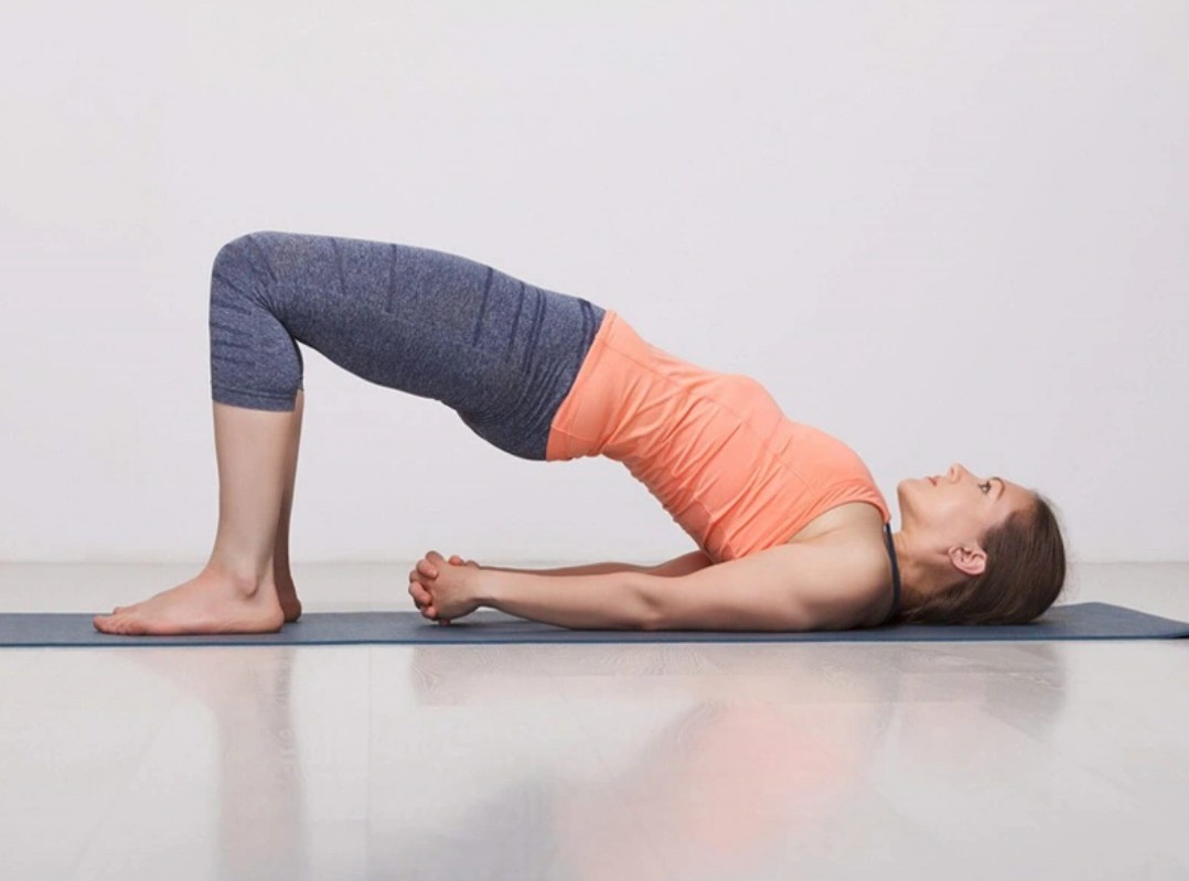 Hít vào và đẩy hông lên trần nhà, đảm bảo đầu, cổ và vai nằm thẳng trên sàn. Hít thở sâu, giữ nguyên tư thế trong vài giây, sau đó, đưa tay trở lại sàn, thở ra trong khi hạ hông xuống đất.