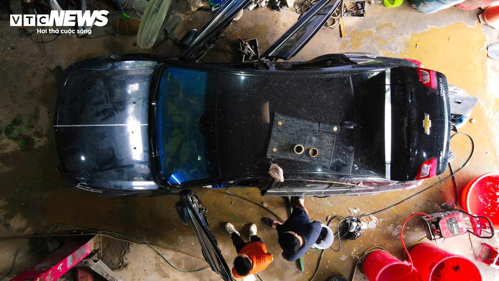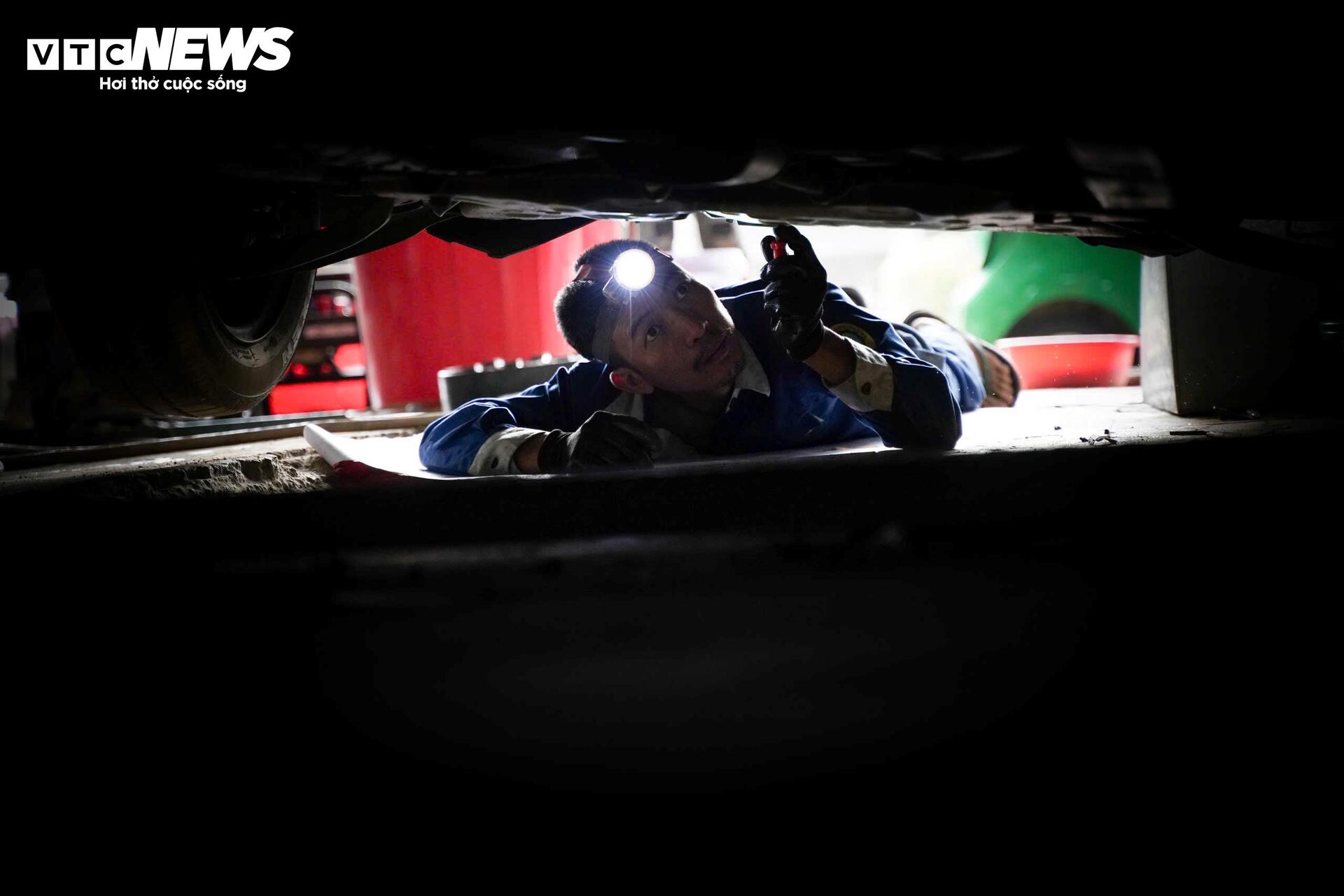 Chiếc xe được nâng lên để kiểm tra gầm. Với những ca phức tạp, thời gian sửa chữa có thể kéo dài. "Nhanh thì 10 ngày, lâu thì nhiều tháng trời", chủ gara cho biết.