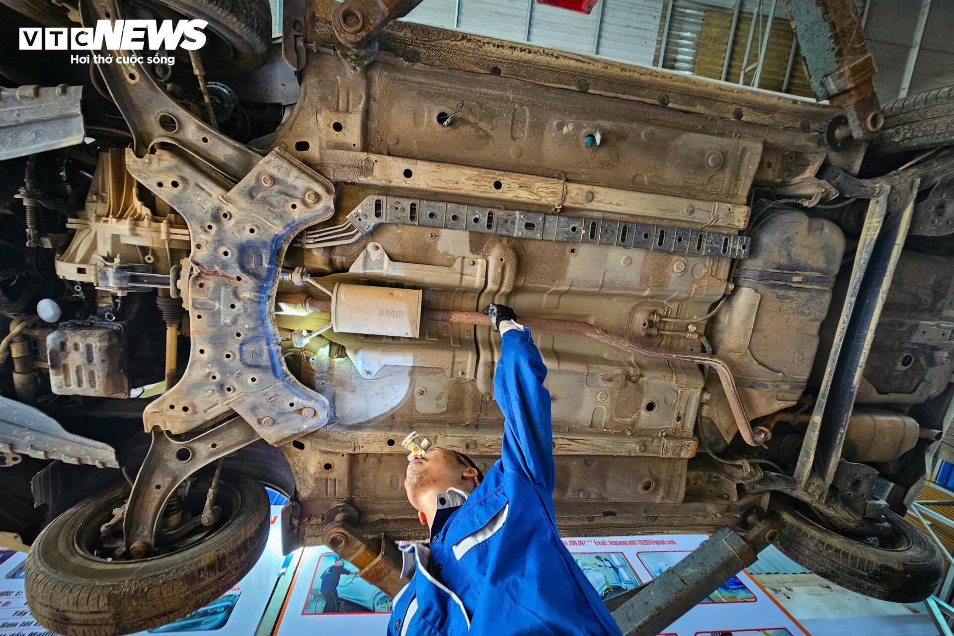 Bùn đất, rác thải bám chặt vào gầm, hệ thống treo và ống xả. Công việc của thợ sửa chữa dưới gầm xe không chỉ vất vả mà còn phải cẩn trọng với các chi tiết bị ăn mòn sau khi tiếp xúc lâu với nước lũ.