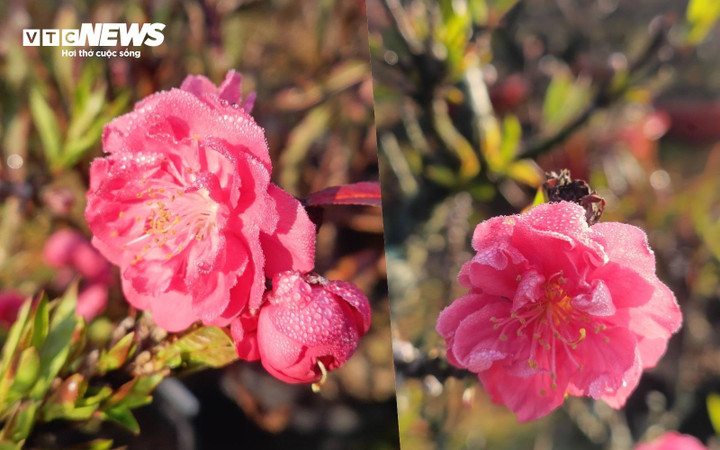 Những bông hoa đào rực rỡ trong sương sớm ở vườn của chị Mai.