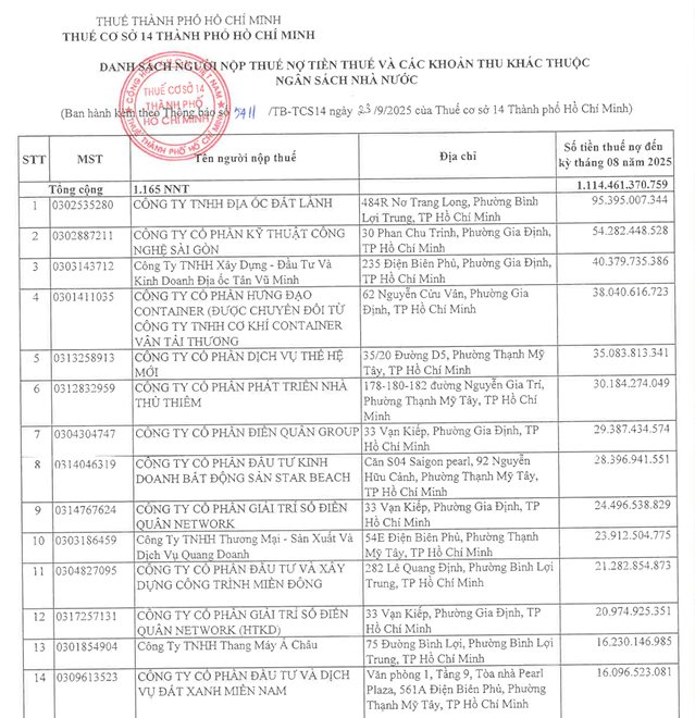 Theo thông báo công khai danh sách người nộp thuế nợ thuế kỳ tháng 8/2025 của Thuế cơ sở 14 TP.HCM (trước đây là Chi cục Thuế quận Bình Thạnh), có tổng cộng 1.165 người nộp thuế bị nêu tên với tổng số tiền nợ lên đến 1.114,46 tỷ đồng.