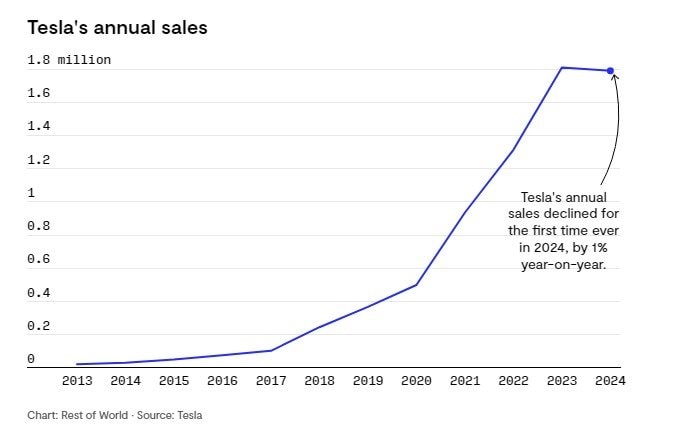 Thế nhưng doanh số Tesla lại đang đi ngược hướng. Năm 2024, hãng ghi nhận mức giảm doanh số thường niên đầu tiên trong một thập kỷ, tiếp theo là quý sụt giảm doanh thu tệ nhất kể từ năm 2022.