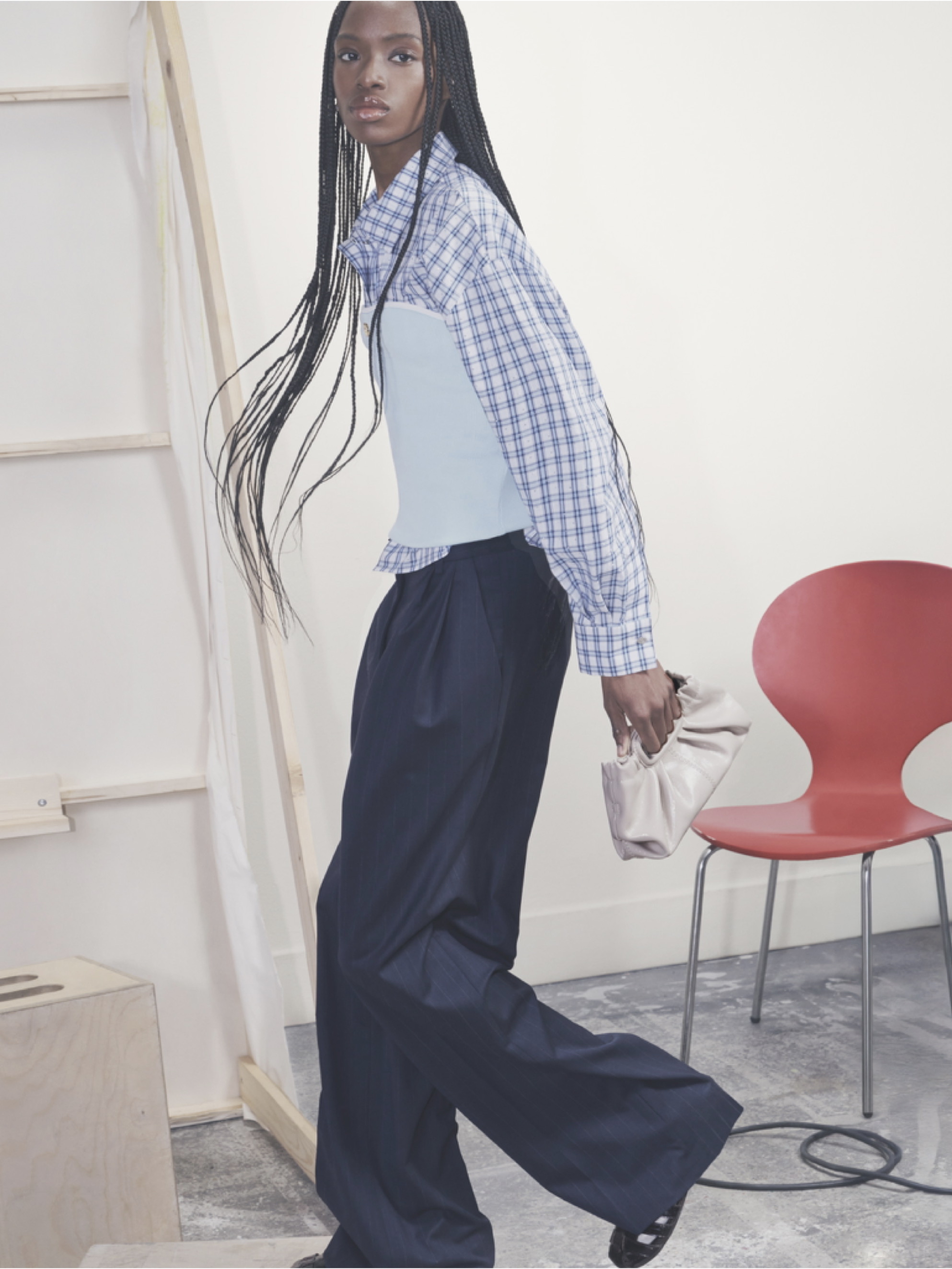 Tinh thần hiện đại còn được thể hiện qua nghệ thuật layering. Sơ mi ca rô phối chi tiết corset pastel đi cùng quần âu xếp ly cho thấy kỹ thuật cắt may chính xác nhưng vẫn linh hoạt. Sắc đỏ nổi bật của quần tất cạnh chân váy denim viền đá lấp lánh và áo khoác be trung tính tạo nên ranh giới mong manh giữa cổ điển và phá cách. Gọng kính mắt mèo đen bóng hay đồi mồi bản lớn khép lại tổng thể bằng một nét bí ẩn vừa đủ.