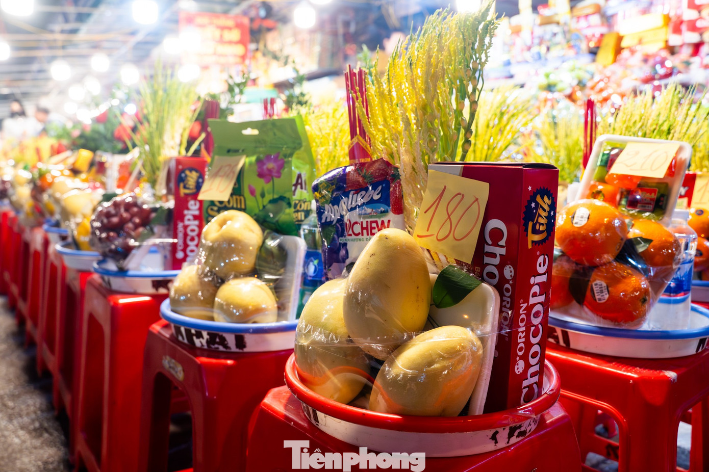 Đồ lễ được các sạp bên ngoài cổng bán theo mâm. Mỗi mâm lễ có giá khoảng 150.000 - 300.000 đồng.