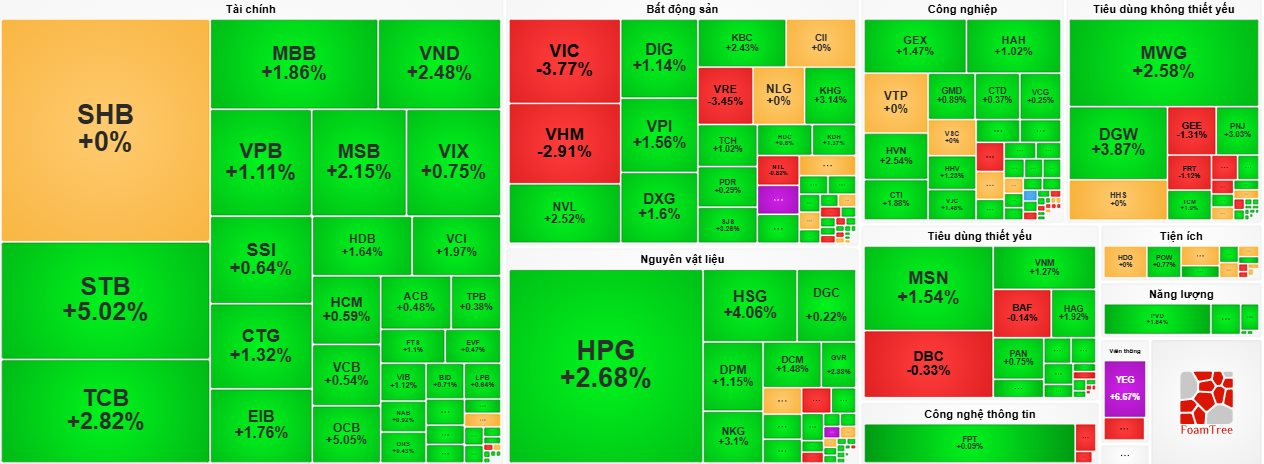 Ngoài ra, loạt cổ phiếu vốn hóa lớn thuộc các nhóm ngành khác cũng tăng mạnh, như: MSN +1,54%, VNM +1,27%, HAG +1,92%, GVR +2,88%, DPM +1,15%, DCM +1,48%, BSR +1,15%, GEX +1,47%, NVL +2,52%, VPI +1,56%, DXG +1,6%, KBC +2,43%, VND +2,48%, VCI +1,97%, …
